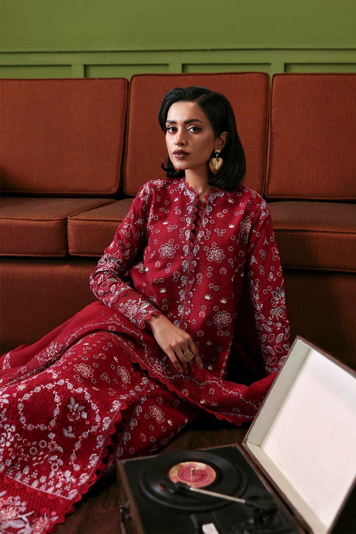 Radiate timeless charm in this luxurious red ensemble, adorned with exquisite embroideries on premium lawn and organza for a regal touch. The gracefully draped khaddi net dupatta adds an ethereal allure, while tailored cotton culotte complete the look with effortless elegance. A perfect harmony of sophistication and style.