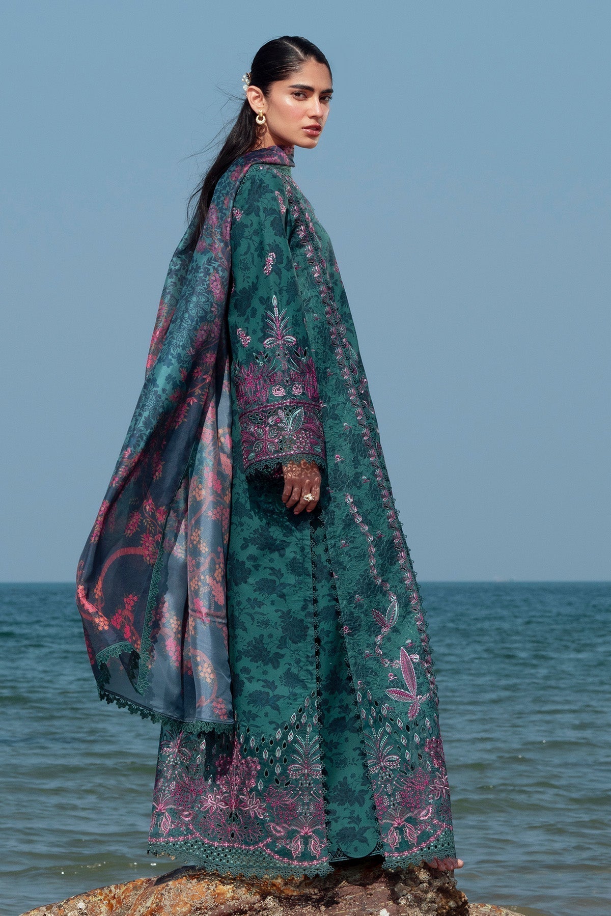 This stunning green ensemble effortlessly blends intricate embroidery with elegant panels and detailed borders, creating a design that radiates sophistication. The trendy printed dupatta adds a contemporary flair, perfectly complementing the ensemble’s modern vibe.