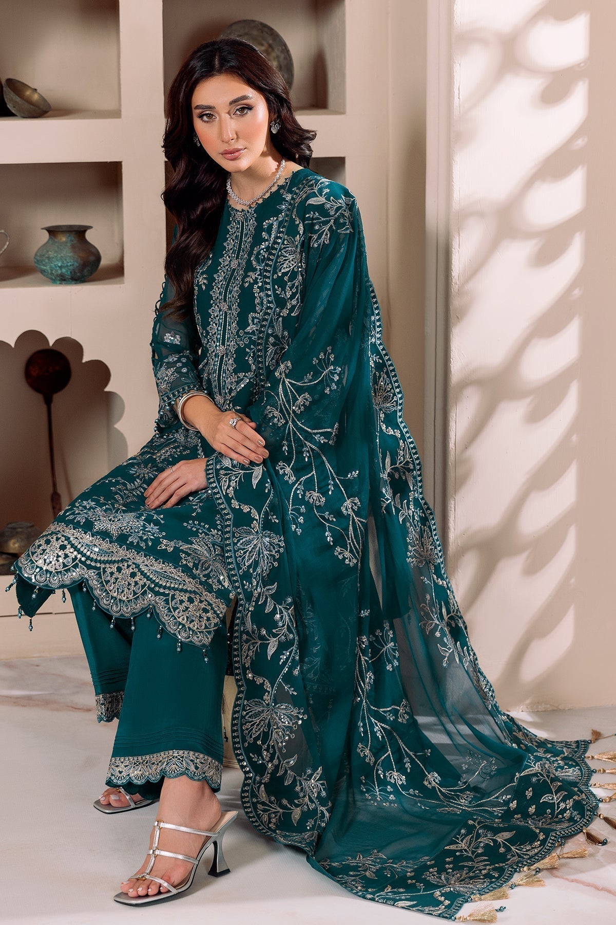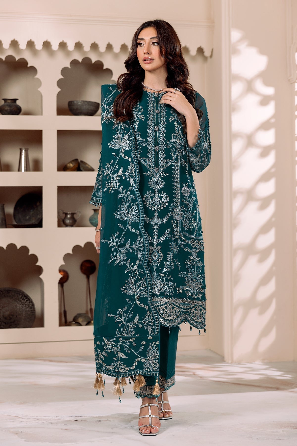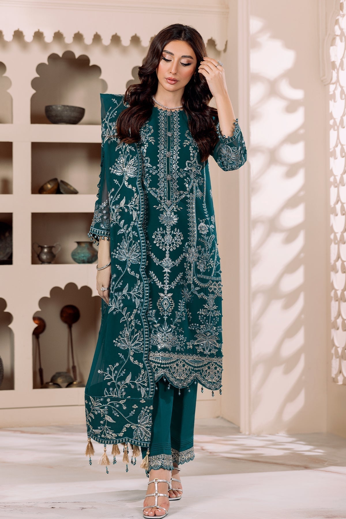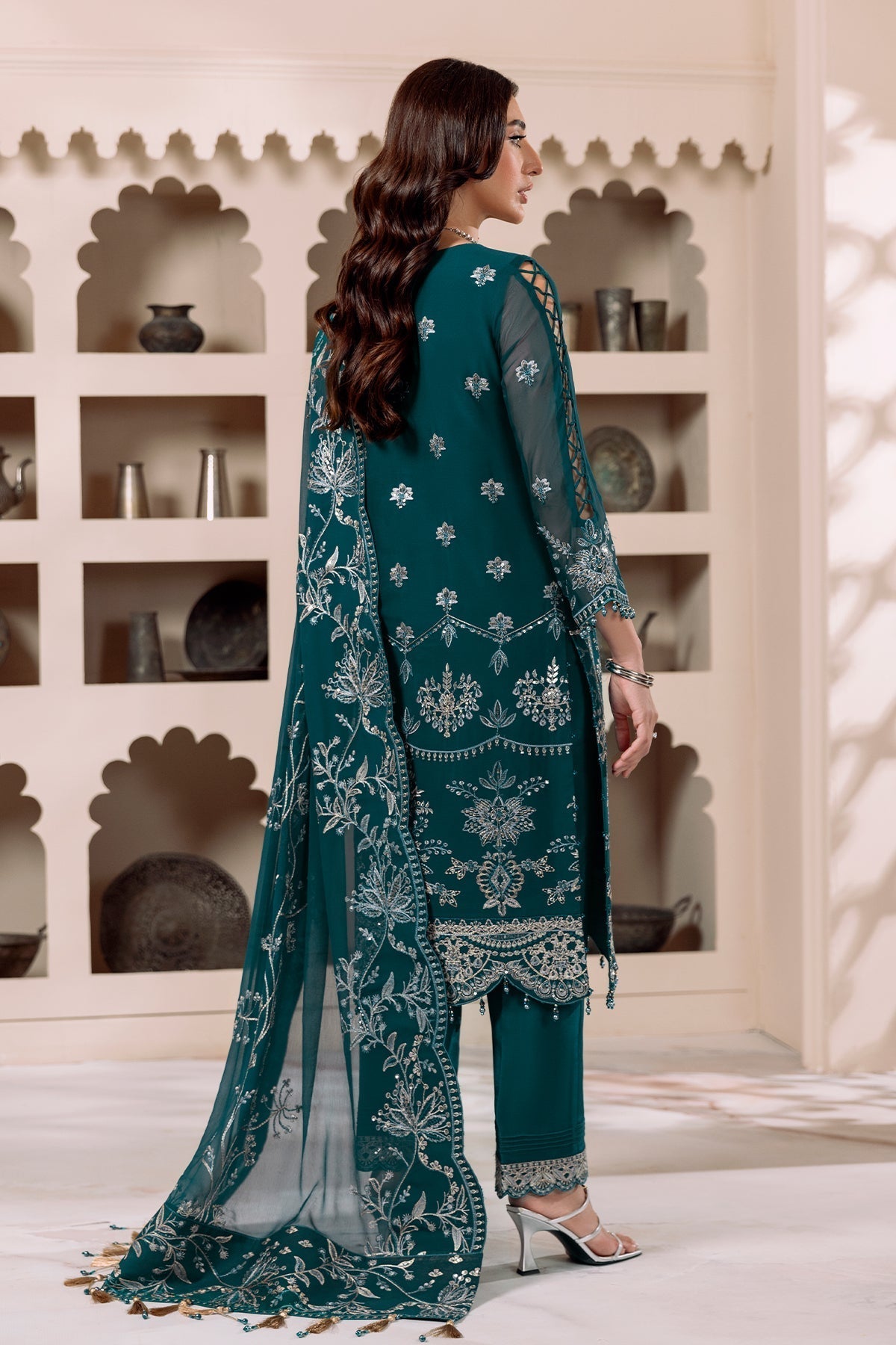 - Stitched includes Shirt, Lining, Dupatta and Trouser all embellished as shown in pictures.
