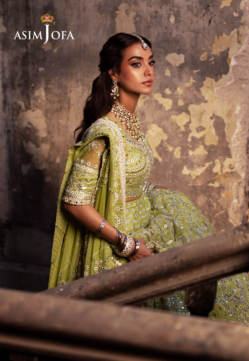 Wrapped in the soft, muted shades of green, this ensemble embodies a quiet elegance. Adorned with delicate golden lurex and beige threads, the fabric glistens with dew-like silver sequins in 9mm and 5mm sizes, capturing a gentle shimmer. The embroidered dupatta, a sheer veil of beauty, crowns this nature-inspired creation, promising a look that captivates with understated grace and leaves an unforgettable impression.