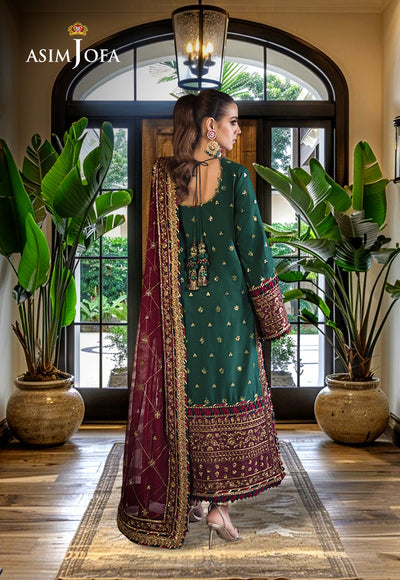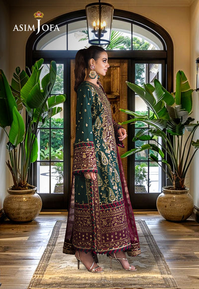 Step into an enchanted forest of style with this mesmerizing ensemble where bottle green and deep magenta hues intertwine like vines in a lush woodland. The intricate gold threadwork, antique gold zari work, lurex, and 5mm sequins shimmer like dappled sunlight filtering through the canopy. The deep magenta neckline, sleeves border, and shirt border stand out like rare blossoms amidst the verdant greenery while embroidered borders and back echo the intricate patterns of nature. The embroidered sleeves with borders add a touch of enchantment and the embroidered lace for chaak whispers secrets. Complete your journey with the deep magenta dupatta adorned with a four-sided border as you immerse yourself in the magic of the forest
