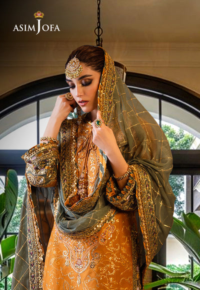 Find serenity in the embrace of sage with this graceful mustard and sage ensemble adorned with gold zari and shimmering sequins. The rust, sage, and self-color threadwork paint a picture of tranquility like ripples on a serene pond. With embroidered neckline, panels and back, this ensemble is a reflection of inner peace and harmony. The embroidered border for daman and sleeves as well as the border for chaak add a touch of understated elegance. Wrap yourself in the embroidered dupatta with borders and let the serenity of sage envelop you in its gentle embrace