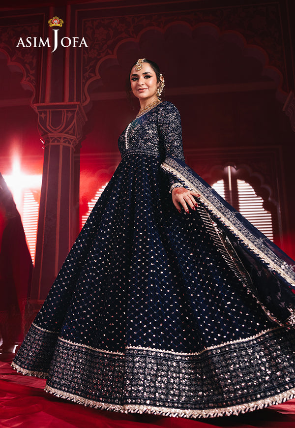 Immersed in the profound depths of an endless ocean, this navy-blue ensemble embodies the essence of monarchial grandeur. The velvet peshwas, a pinnacle of contemporary luxury, is adorned with light gold zari that cascades like streams of liquid gold, interwoven with Banarasi gold cupped sequins, mirroring the brilliance of stars shimmering in a velvety midnight sky. Paired with a quintessentially embroidered dupatta, exuding an airy magnificence, this masterpiece weaves a tapestry of royal dreams, transforming elegance into a timeless reality.