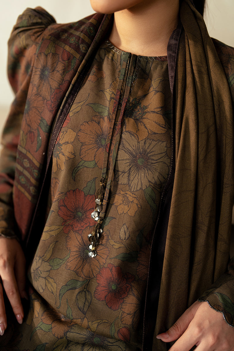 This captivating digital printed slub khaddar shirt and trouser set is paired with a twill shawl, offering a seamless blend of style and comfort, designed to impress at any social gathering.