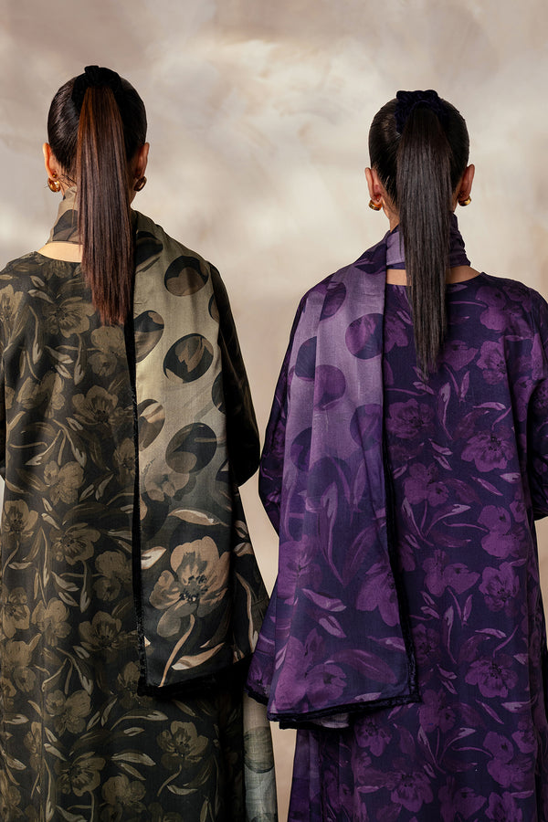 Experience the blend of digital prints and exquisite schiffli embroidery on slub khaddar fabric, making up the shirt and trousers, along with a digital printed twill shawl.