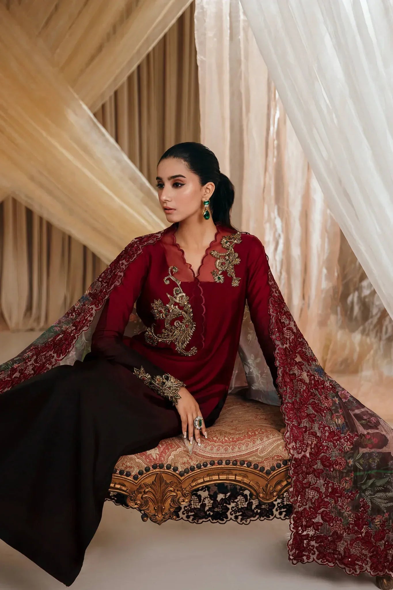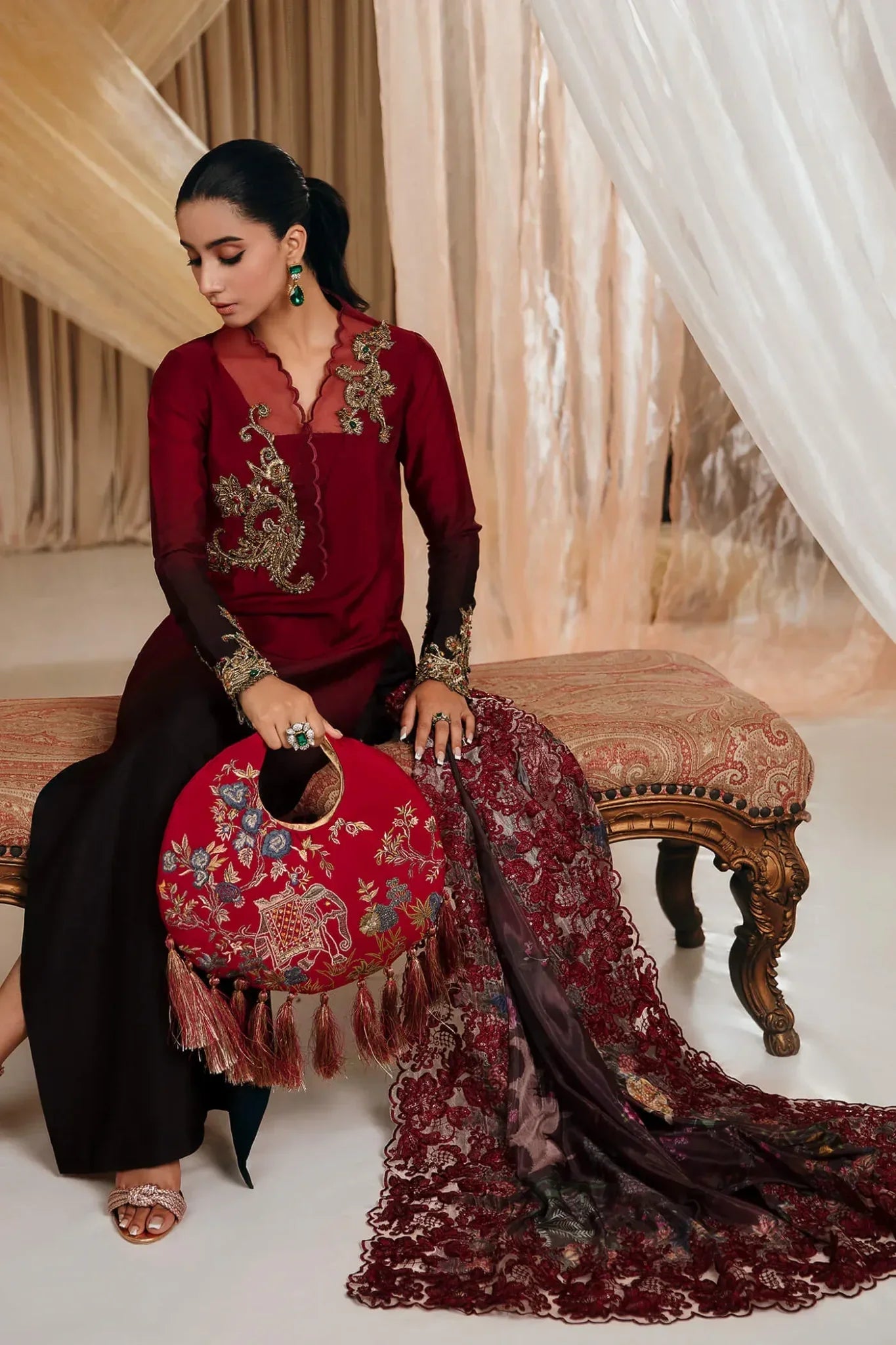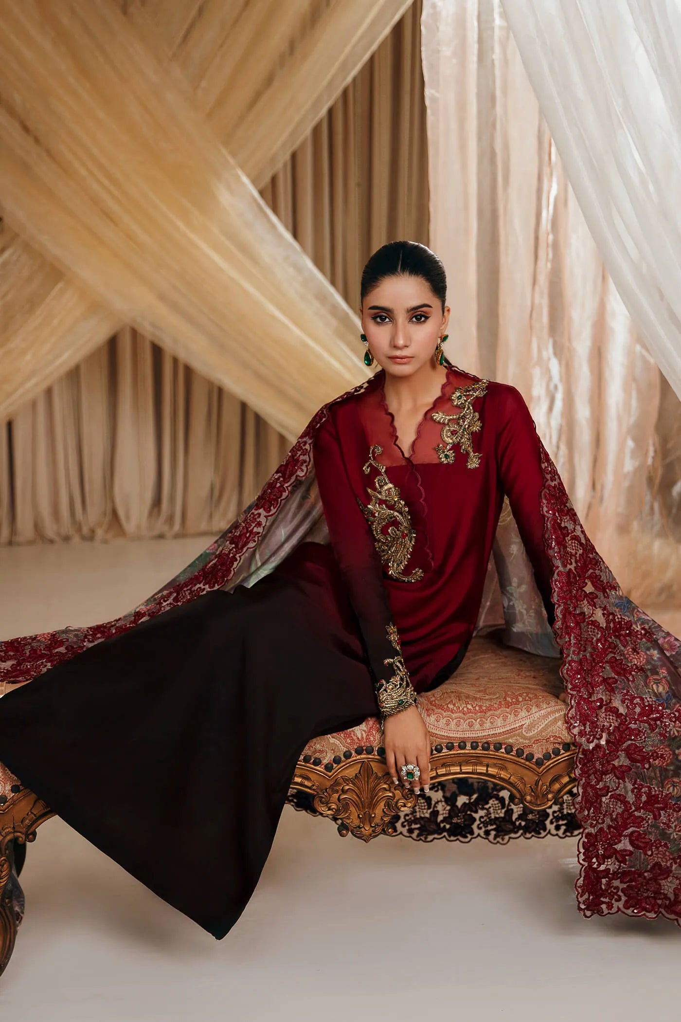 gracefully shades from maroon to black. This exquisite creation is richly adorned with intricate