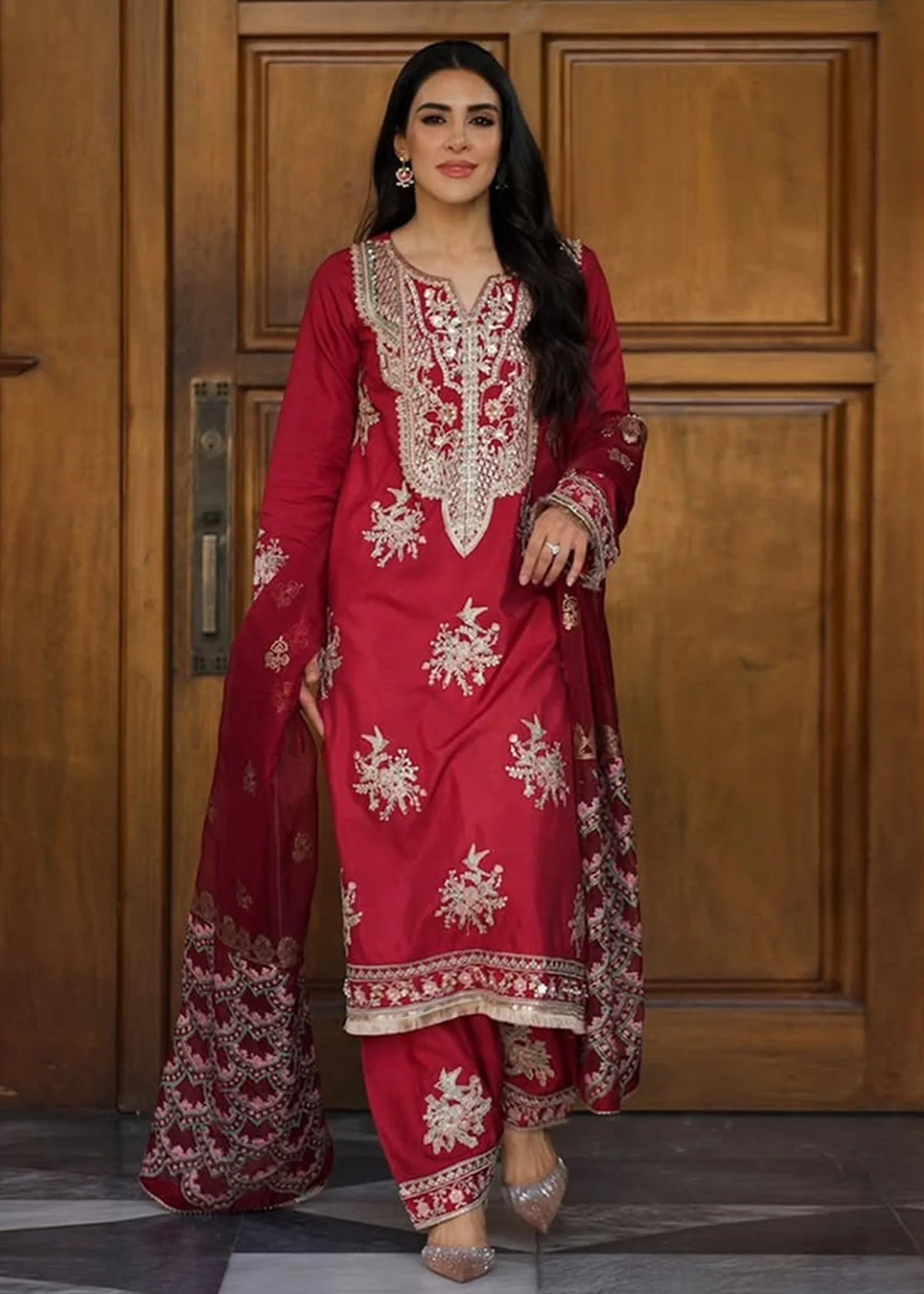 Divinely gorgeous, ‘Crimson’ is a beauty like no other. Team Shurooq has outdone itself with this red number. Absolutely stunning gold tilla embroideries with resham thread work add life to the silk shirt and trouser. Hand applied sitara, pearls and stone beading bring opulence to the ensemble paired together with a delicate block printed organza dupatta.
