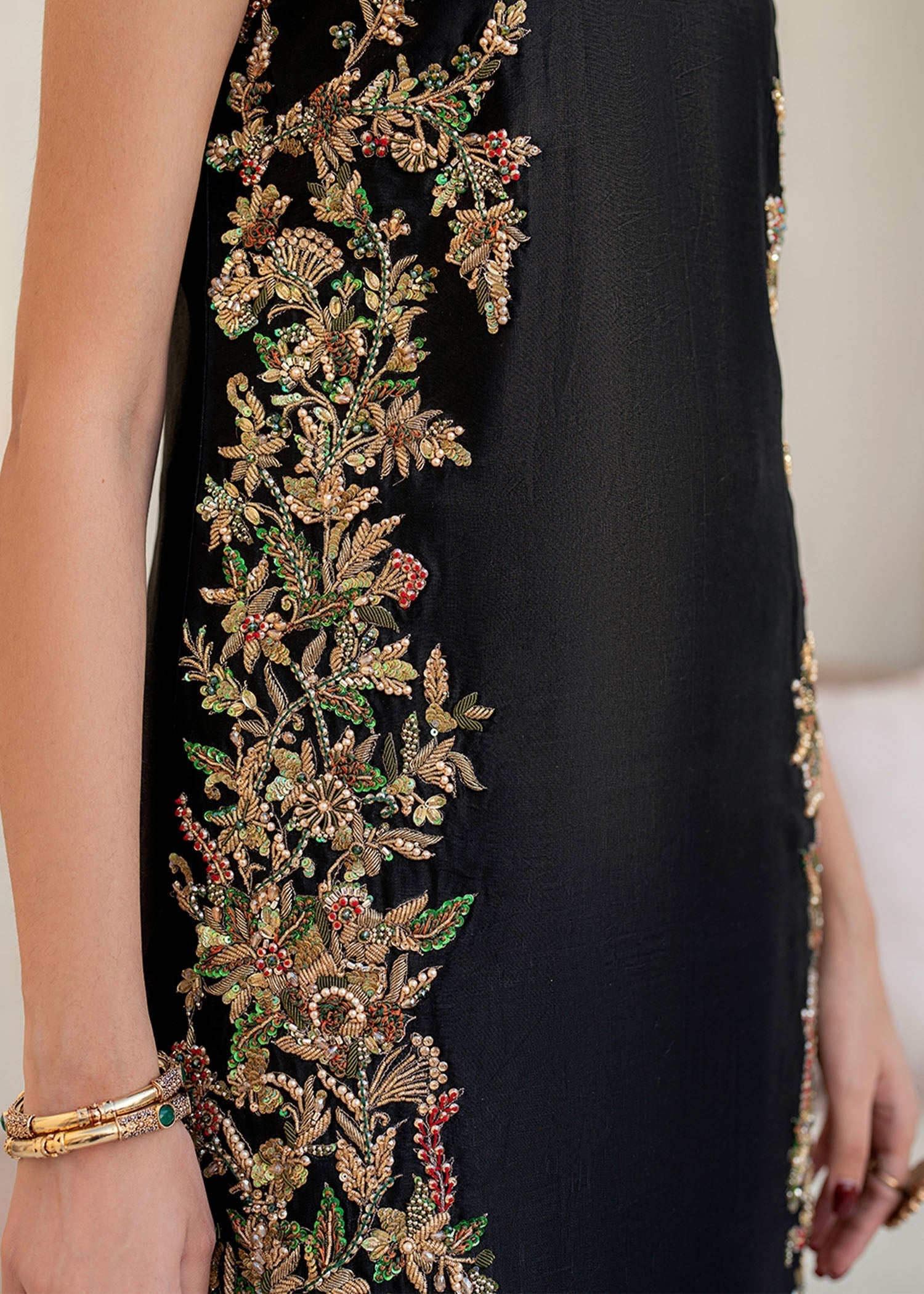 As the moon glows bright on Eid nights, Liyana shines with equal elegance. This stunning black ensemble features a tissue silk shirt and sharara, adorned with intricate hand embroidery and sequin beads, paired with an elegant Organza dupatta. Perfect for those who crave luxury and sophistication during the festive season!