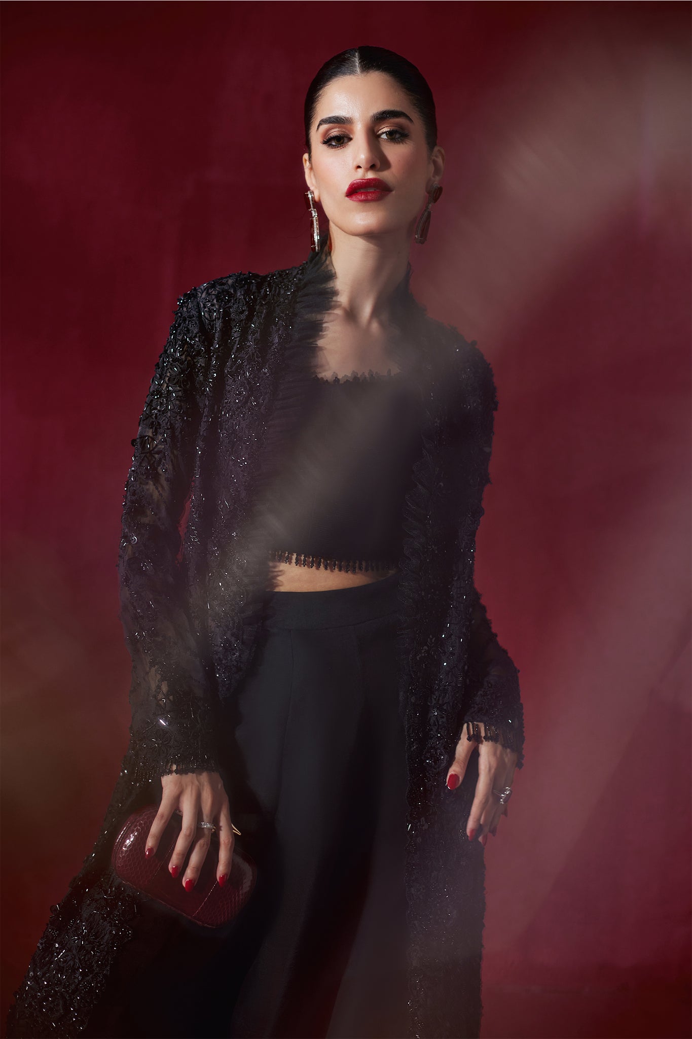 Adorned with obsidian beads in an exquisite cutwork technique, the 'Nuit Étoilée' ensemble exudes opulence and sophistication. Its flowing, front-open jacket captures attention with its intricate craftsmanship and shimmering sequins that add a touch of allure. Paired with the quintessential Elan tassel blouse, this ensemble radiates refined glamour. Finely crafted organza pants, delicately bordered with scintillating sequins, complete the look, showcasing an exceptional blend of luxury and artistry.Step into the enchanting allure of the festive season with the distinguished elegance of ‘Cristal Foncé’. This opulent ebony ensemble showcases a long jacket adorned in a mesmerizing lattice of obsidian crystals, each meticulously positioned to radiate unparalleled brilliance. Paired flawlessly with impeccably tailored pants, this bespoke creation exudes fluid grace, making a resolutely sophisticated statement at every turn.