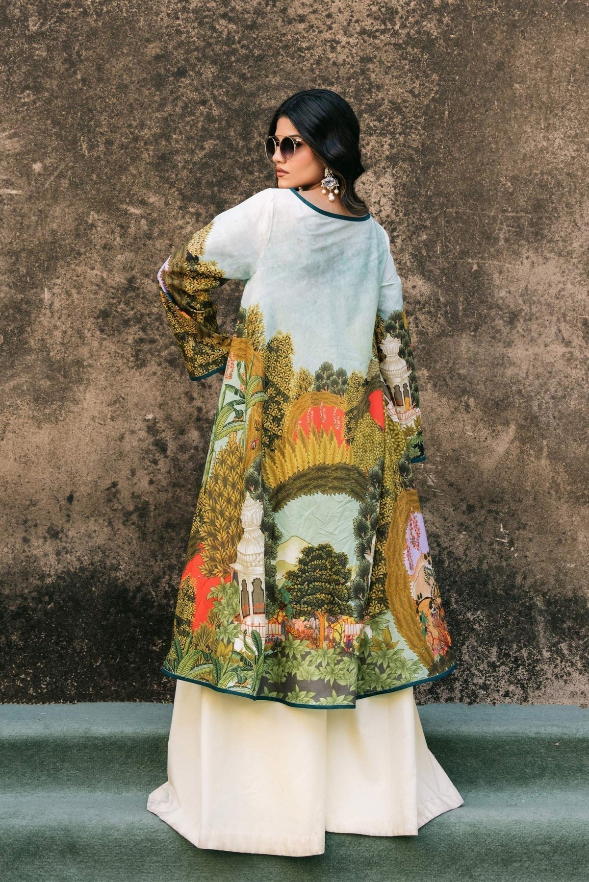 A beautifully crafted lawn drape shirt, made from premium-quality fabric and embellished with elegant digital printing, inspired by the serene beauty of miniature gardens in refined hues.