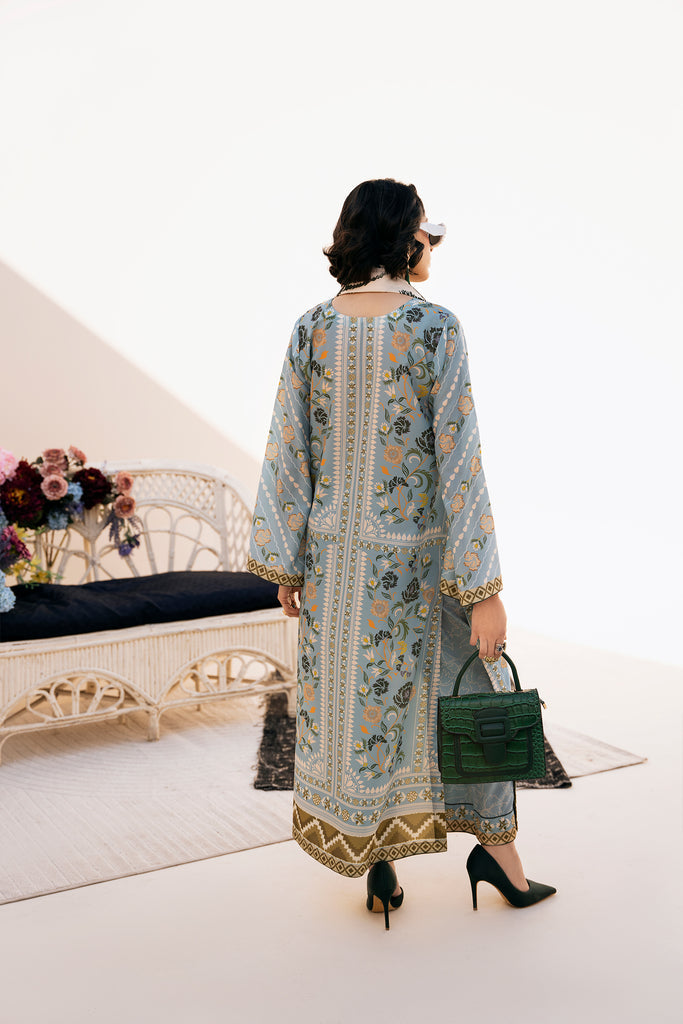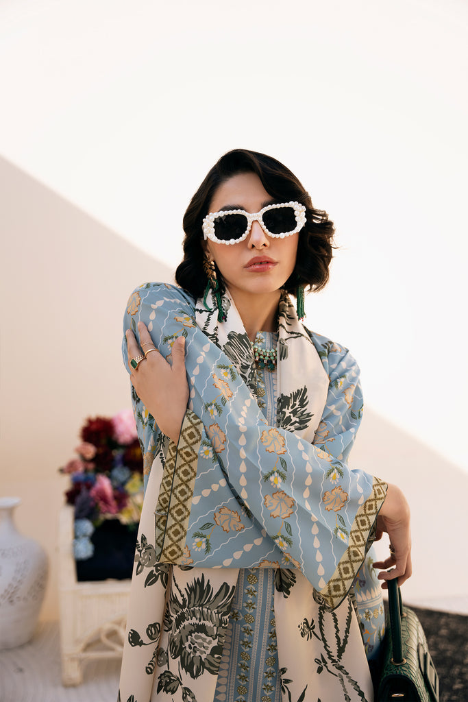 Soft shades and a lovely floral print. This long shirt silk silhouette is perfect for any occasion. The set comes with a complimentary scarf to style this season.
