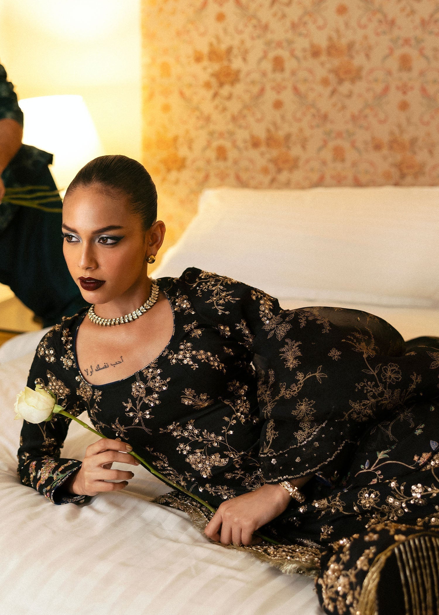 Make a stunning statement with this elegant black raw silk shirt, beautifully adorned with golden screen printing and intricate embellishments. Loop buttons on the cuffs enhance the refined aesthetic, making this piece truly eye-catching. Paired with a screen-printed black organza dupatta, this ensemble showcases a delicate multihead border that adds a touch of glamour. The embellished screen-printed shalwar perfectly complements the shirt, while the navy blue chanderi silk poncha with gotta lines introduces a unique and stylish contrast. This outfit is ideal for festive occasions, evening events, or any special celebration, combining traditional elegance with contemporary flair. Elevate your wardrobe with this striking ensemble that radiates sophistication and grace.