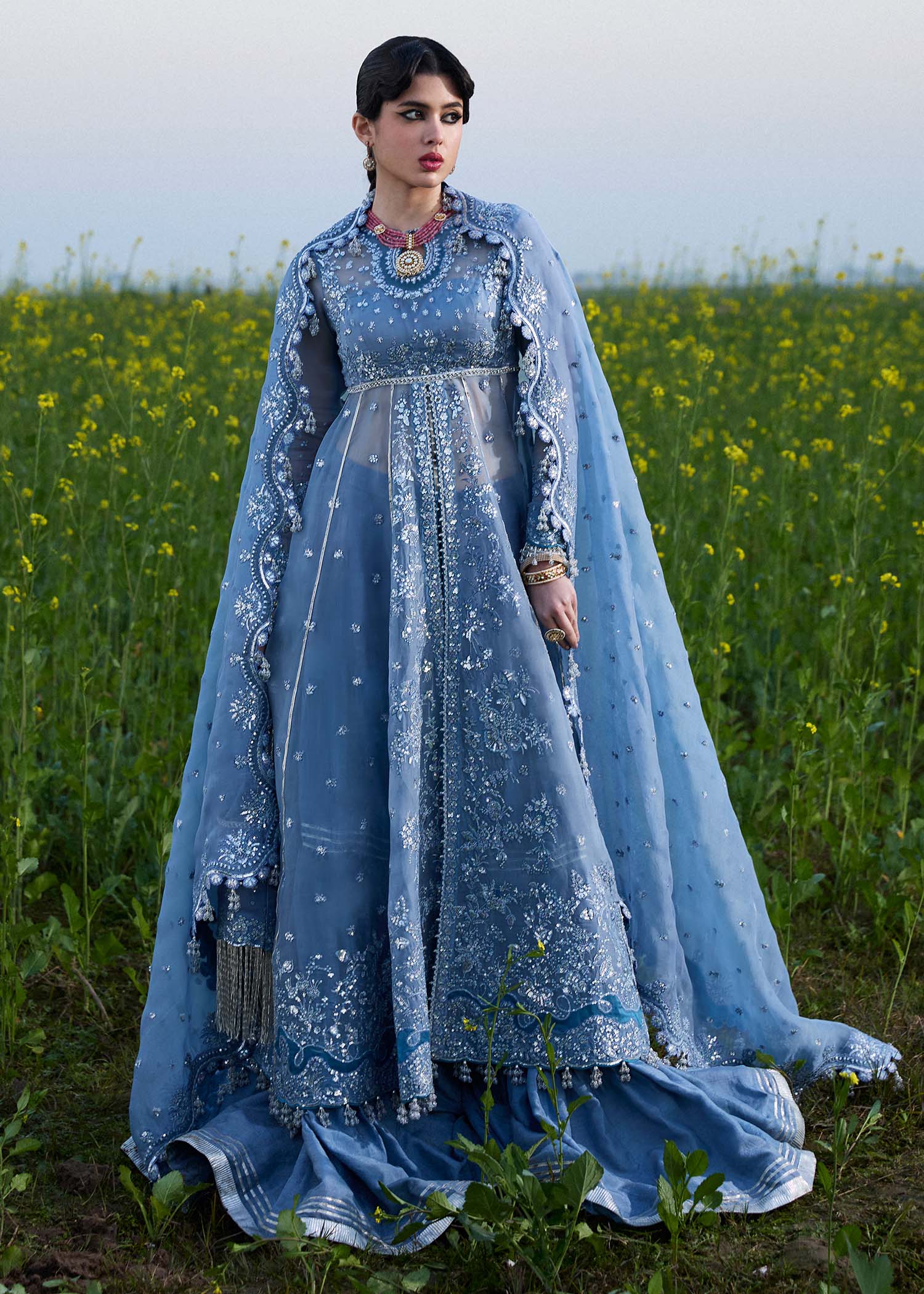It's a front open organza peshwas. The choli and sleeves are embroidered, and attached with embroidered panels. This peshwas is paired with Korean Raw-silk sharara, which adds a traditional touch. And the dupatta is made of organza with embroidered four side borders, giving it sophistication. This outfit is definitely a head-turner and perfect for any special occasion or event.
