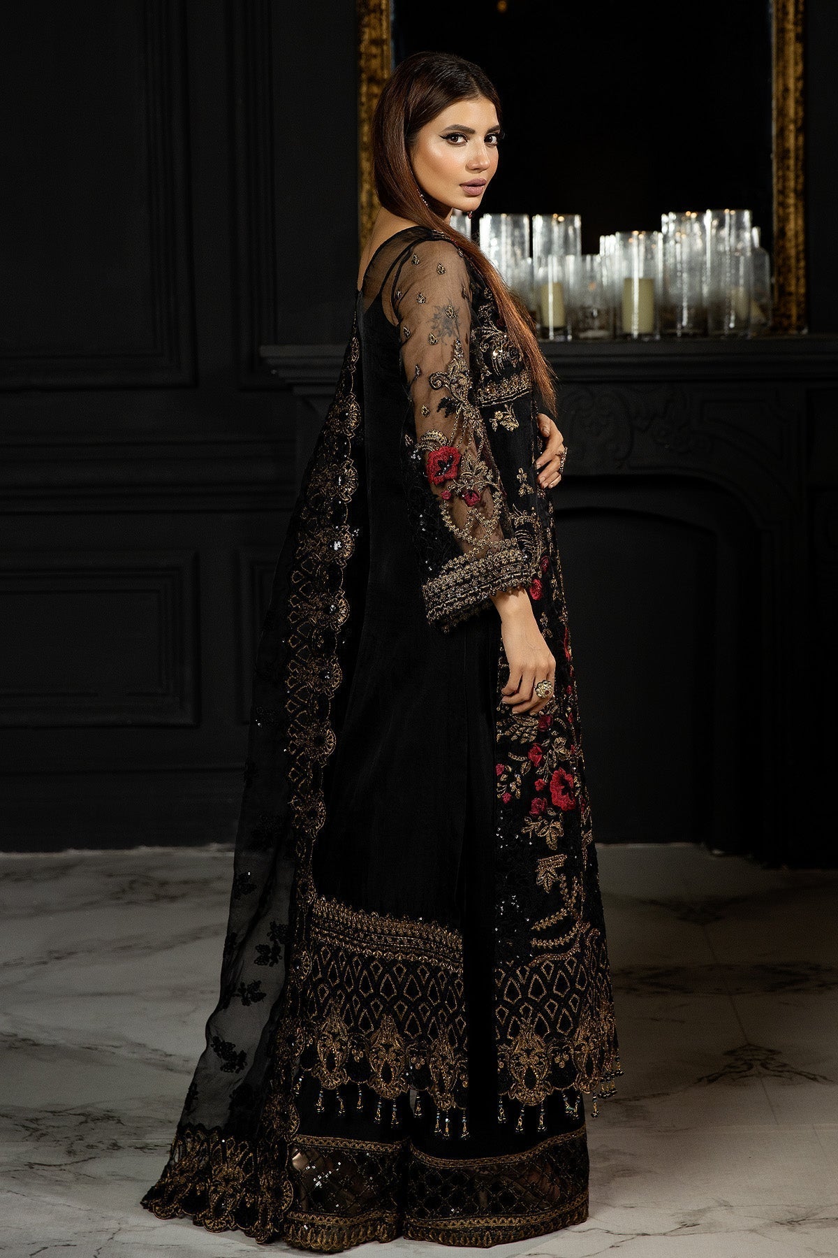 Embroidered organza for sleeves embellished with stone work.