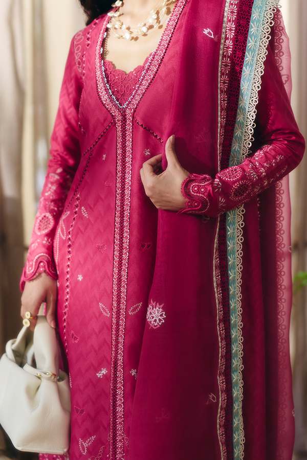 Coral pink front open, pure cotton jacquard shirt with a layered neckline enhanced by lacework and net. Self and off-white embroidery with hints of ice blue. Fitted sleeves finished with laces and stitching details.