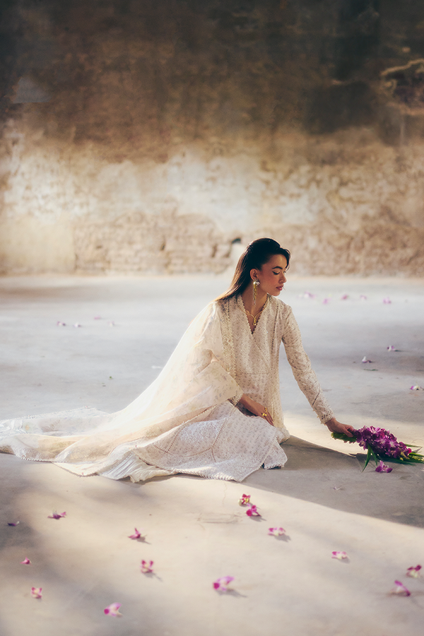 - Porcelain White Silk Panelled Anghrakha style shirt, printed grip base with colours in hints of green and pink to contrast the porcelain. The shirt is further enhanced in same-tone, white embellishments and embroidery. Fitted sleeves and lacework finish the look.
