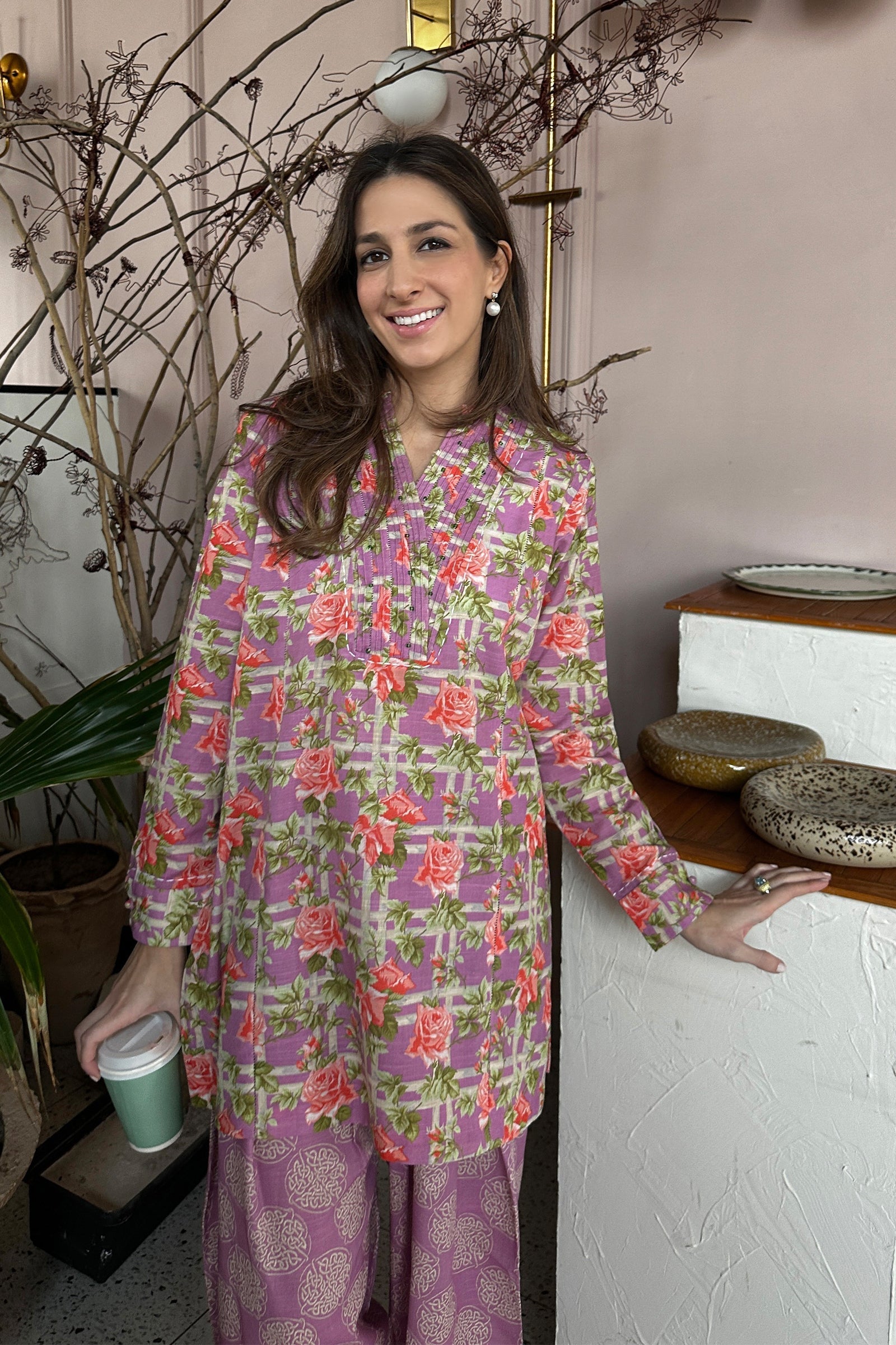 Introducing "Daisy", a luxurious 2-piece khaddar ensemble in a soft lilac base, beautifully adorned with delicate pink roses. This exquisite design captures the serene allure of winter's cool embrace, perfectly complemented by the graceful beauty of blooming florals—making it a timeless addition to your winter wardrobe.