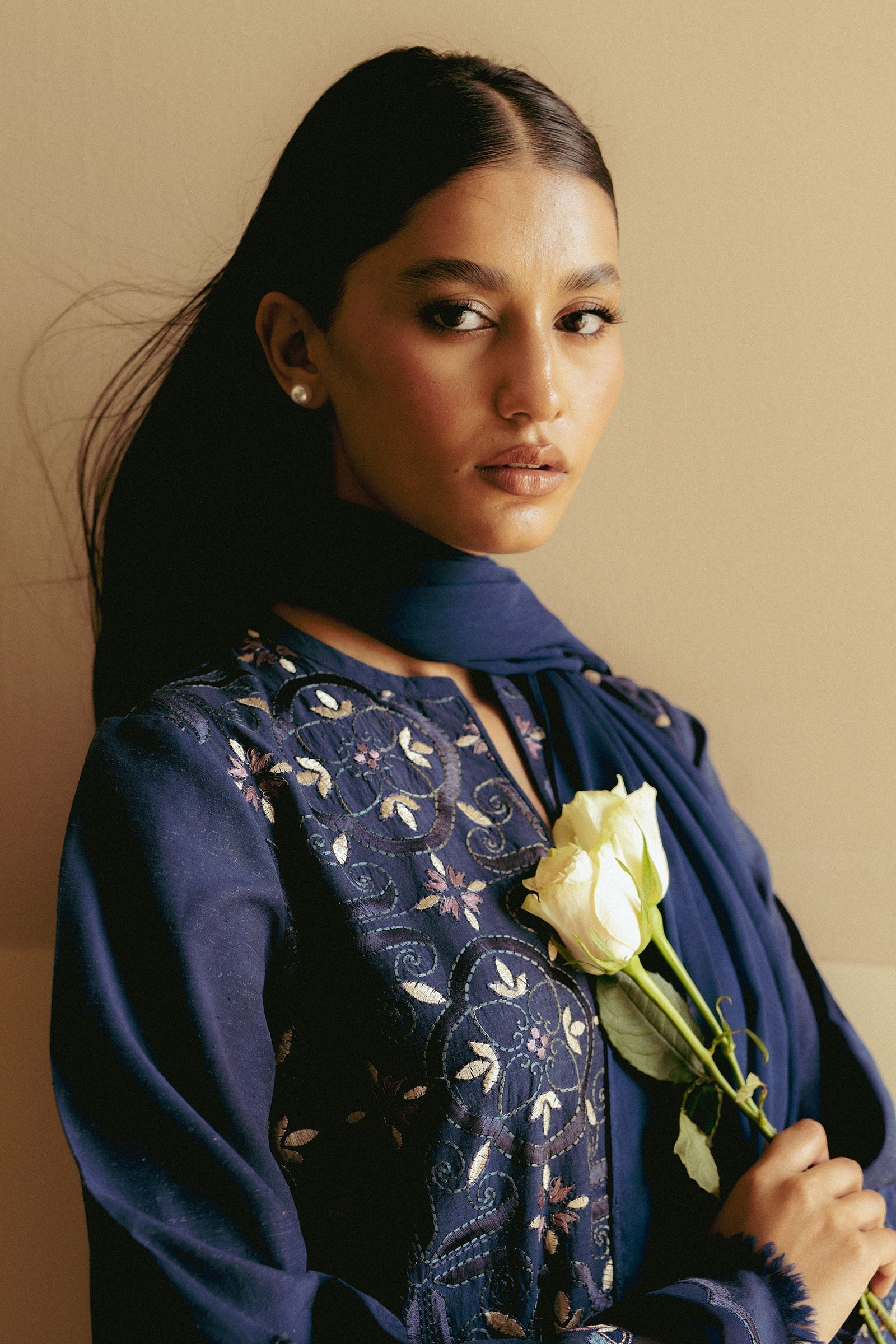 An embroidered regular-fit kurta paired with an embroidery-detailed tapered shalwar and a tonal dupatta.