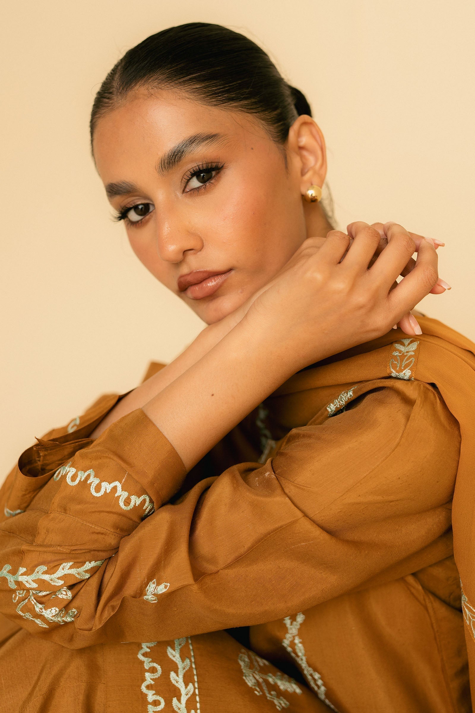 Our ochre regular-fit kurta with embroidery is paired with a cutwork-detailed cropped wide-hem pants and elevated with an embroidered dupatta.