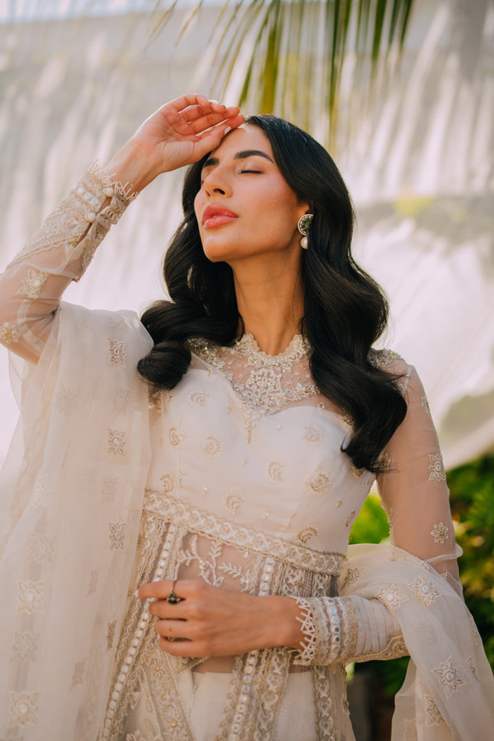 “Lila” is a beautiful ivory shade organza frock which is embellished with delicate details all over. The dazzling color and textures creates a mesmerising effect that captures the eye. It is paired with raw silk pants and jacquard organza dupatta that adds a touch of whimsy to the ensemble.