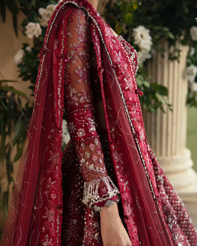 A gorgeous barn red forms the canvas, accentuated by rich cherry and coral hues. The ensemble is intricately adorned with silver and cherry threads, enhanced with rouge accents, and touched by silver tinsels that sparkle with the luminosity of iridescent pearls, glistening sequins, and meticulous handwork embellishments. The shirt's sleeves boast three different shades of red, creating a captivating design. Paired with a tonal trouser, the outfit is completed by an embellished net dupatta featuring a diamante spray on a coral base. The contrasting red dome pallus, adorned with coral four-sided satin borders, add an extra layer of sophistication to this stately look.