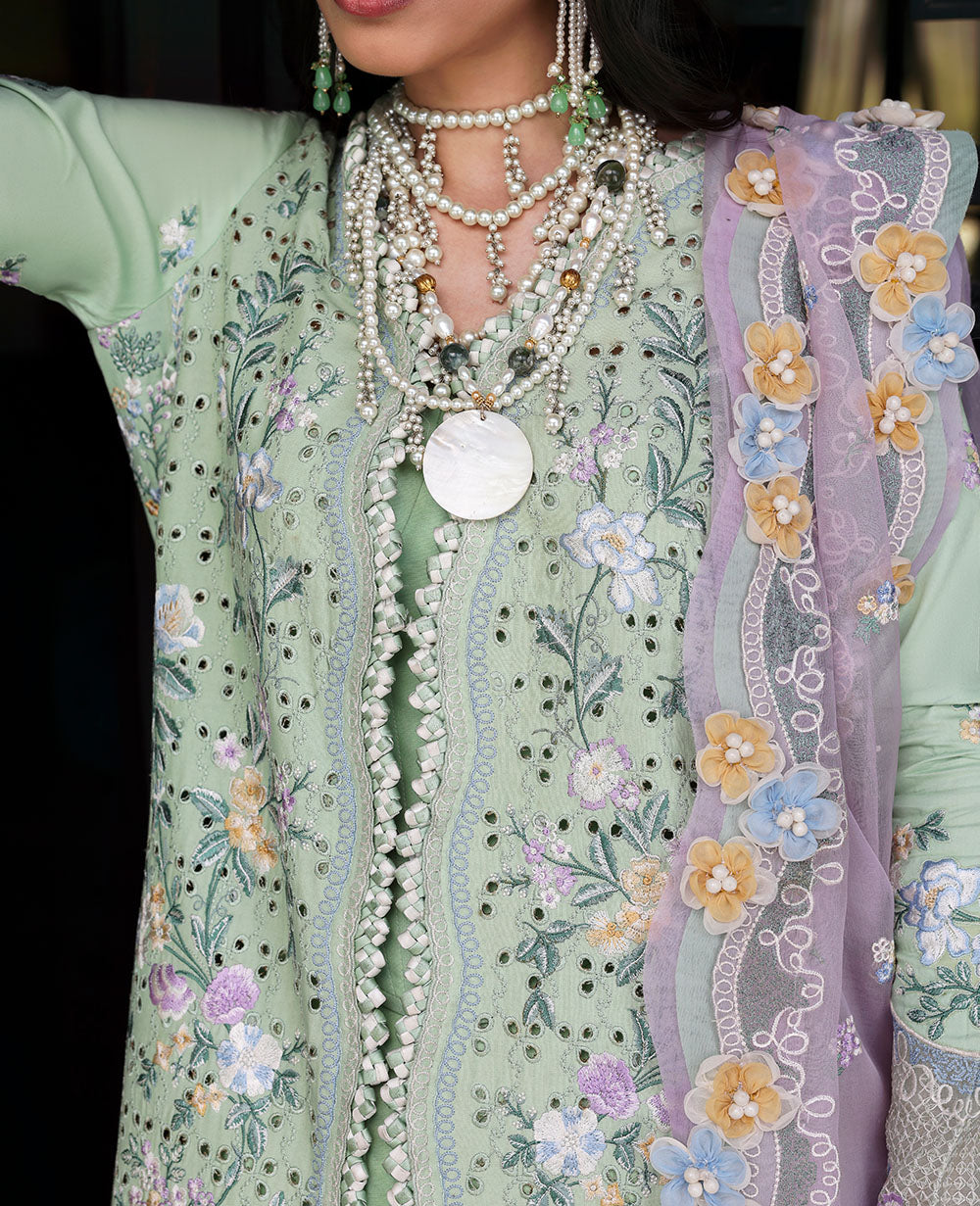 ‘Arzoo’ embodies timeless sophistication with its rich mint green schiffli accents, creating a striking balance of elegance and charm. Designed for Eid lunches and festive gatherings, this ensemble features a fully embroidered front panel, showcasing intricate craftsmanship, while the delicately embroidered sleeves add a refined touch of luxury. The outfit is further elevated with an ethereal contrasted organza dupatta, adorned with delicate pallu borders and exquisite schiffli embroidery, exuding grace and sophistication. Paired with tailored cambric trousers, ‘Arzoo’ is a perfect blend of subtle luxury and effortless festive allure.