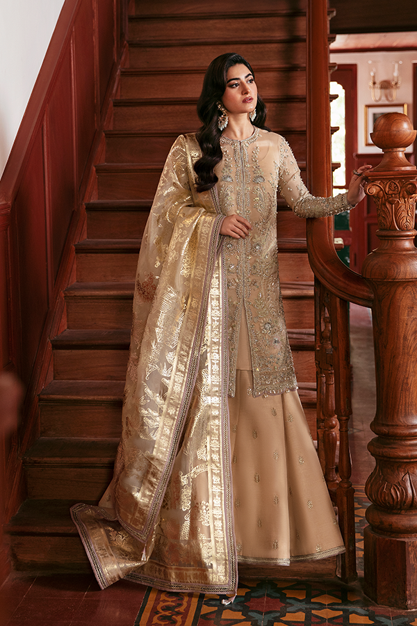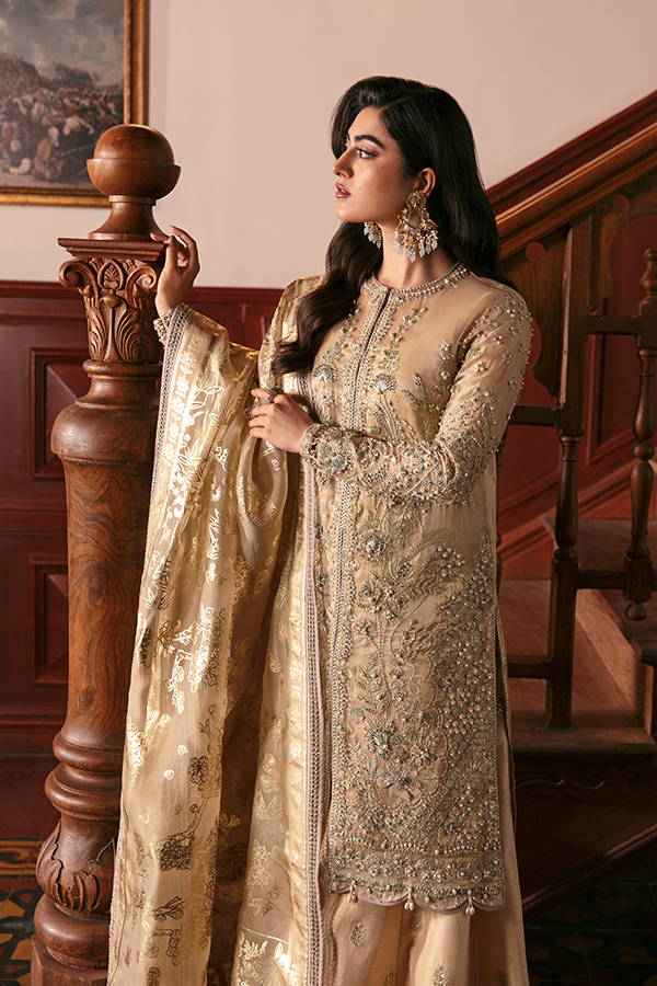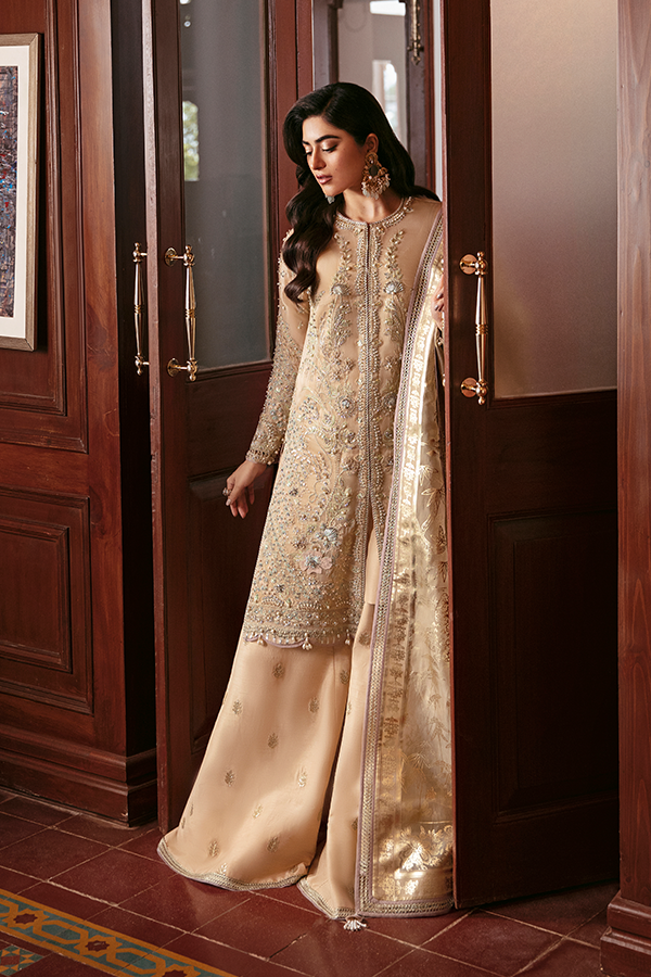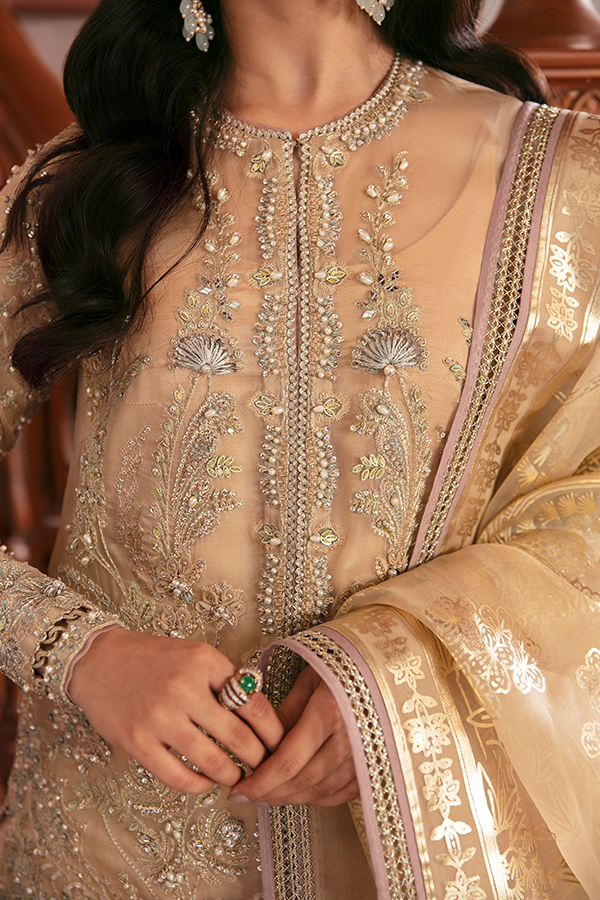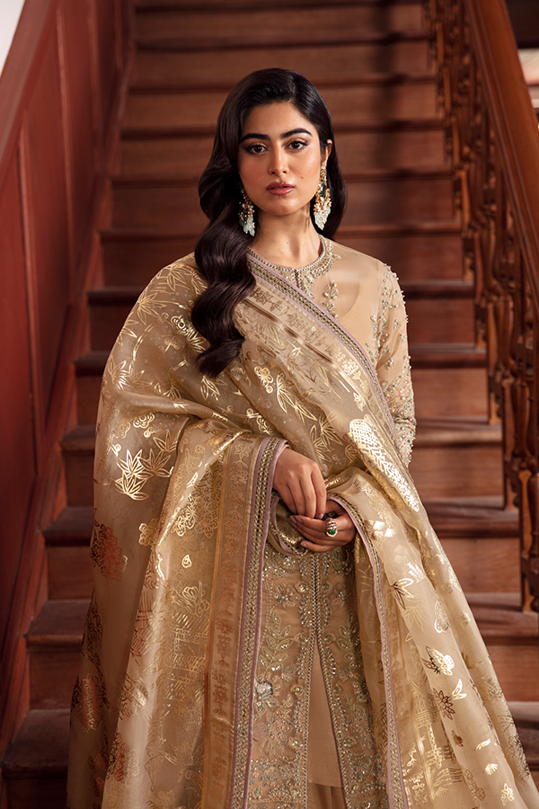 A Golden Symphony of Style! Lumene RTW unveils an unmatched vision in the form of a resplendent golden organza shirt with an open cut, gracefully paired with a regal raw silk sharara adorned with abstruse patterns. A celestial touch is added by the screen-printed dupatta featuring delicate lilac cut-work borders, elevating your fashion quotient to celestial peaks.