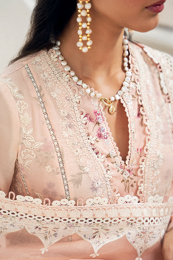 Pastel peach flared overlapped peach paper lawn double layered shirt: A top layer of paper lawn and printed undershirt. Pure cotton for both. It comes with white embroidery details with a finishing of laces and stitching details at hem and fitted sleeves.