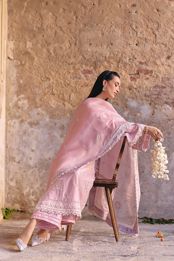 • Powder Pink Silk, kurta style with angular v neckline decorated applique organza with bell sleeves with lacework at borders and hanging tassel accents. The shirt has stitching detail with loops and applique work and scattered embroidery to finish the look. The hem thoroughly embroidered with pink tassels and lace details.