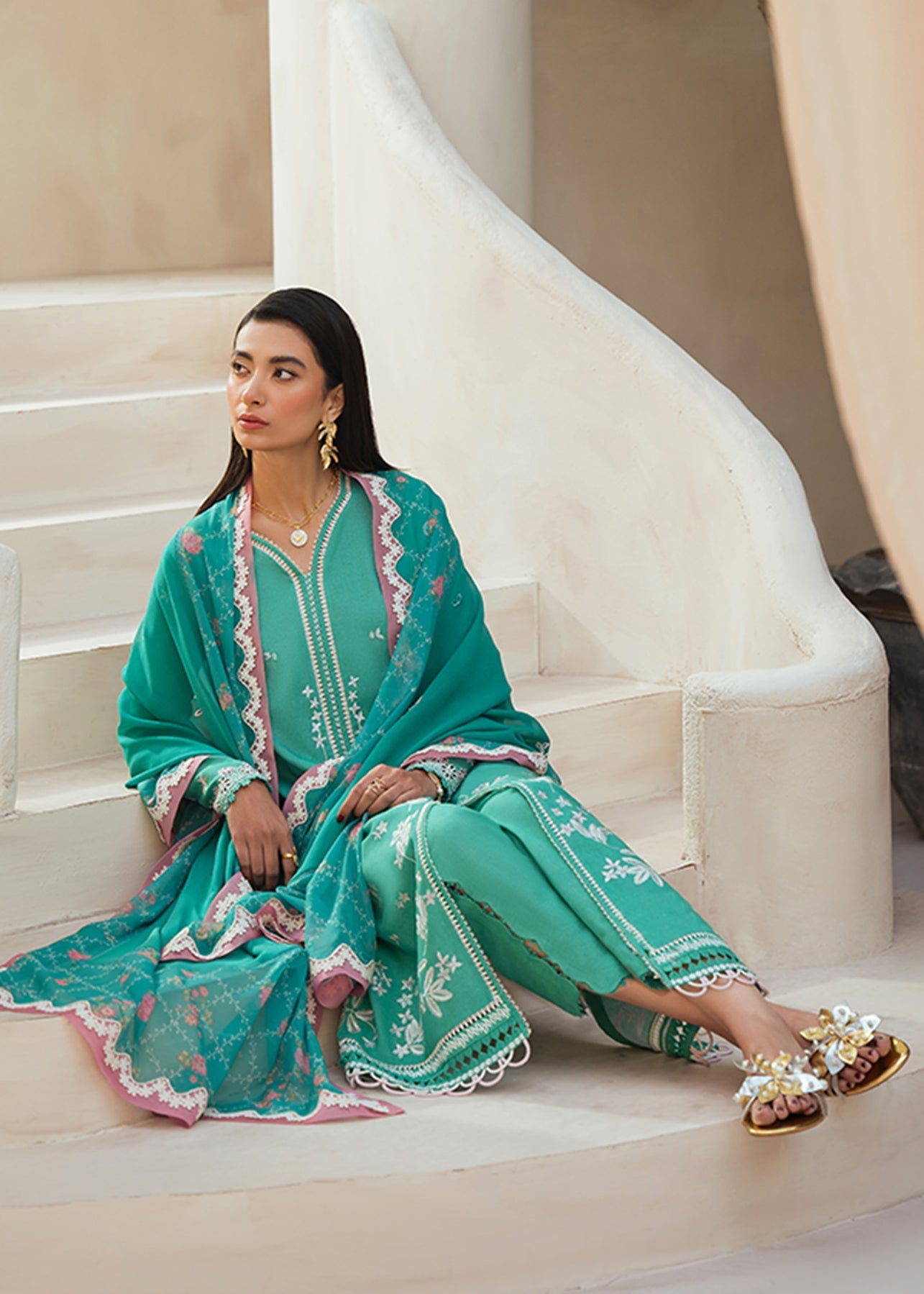 - Caribbean green on summer karrandhi, front open a-line silhouette. V neckline on an embroidered shirt with fitted sleeves and cutwork details. Further stitching details on hem.