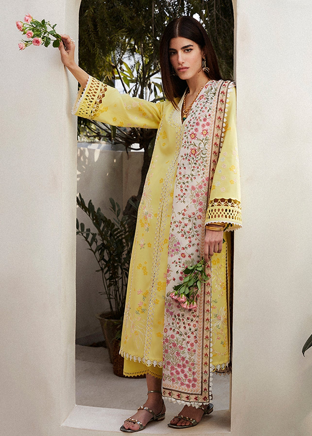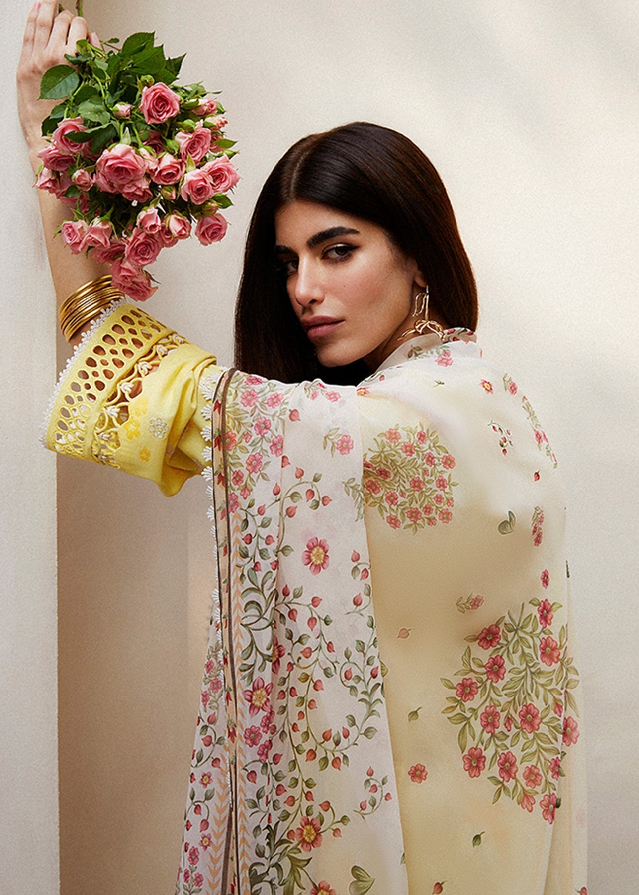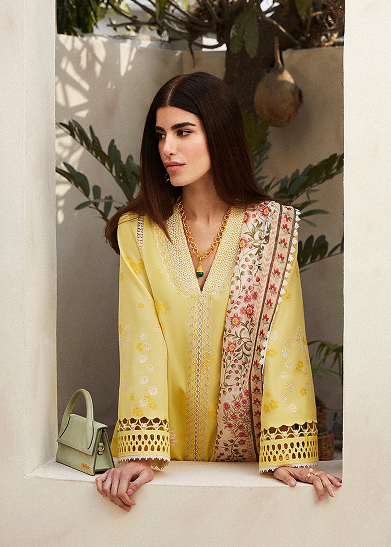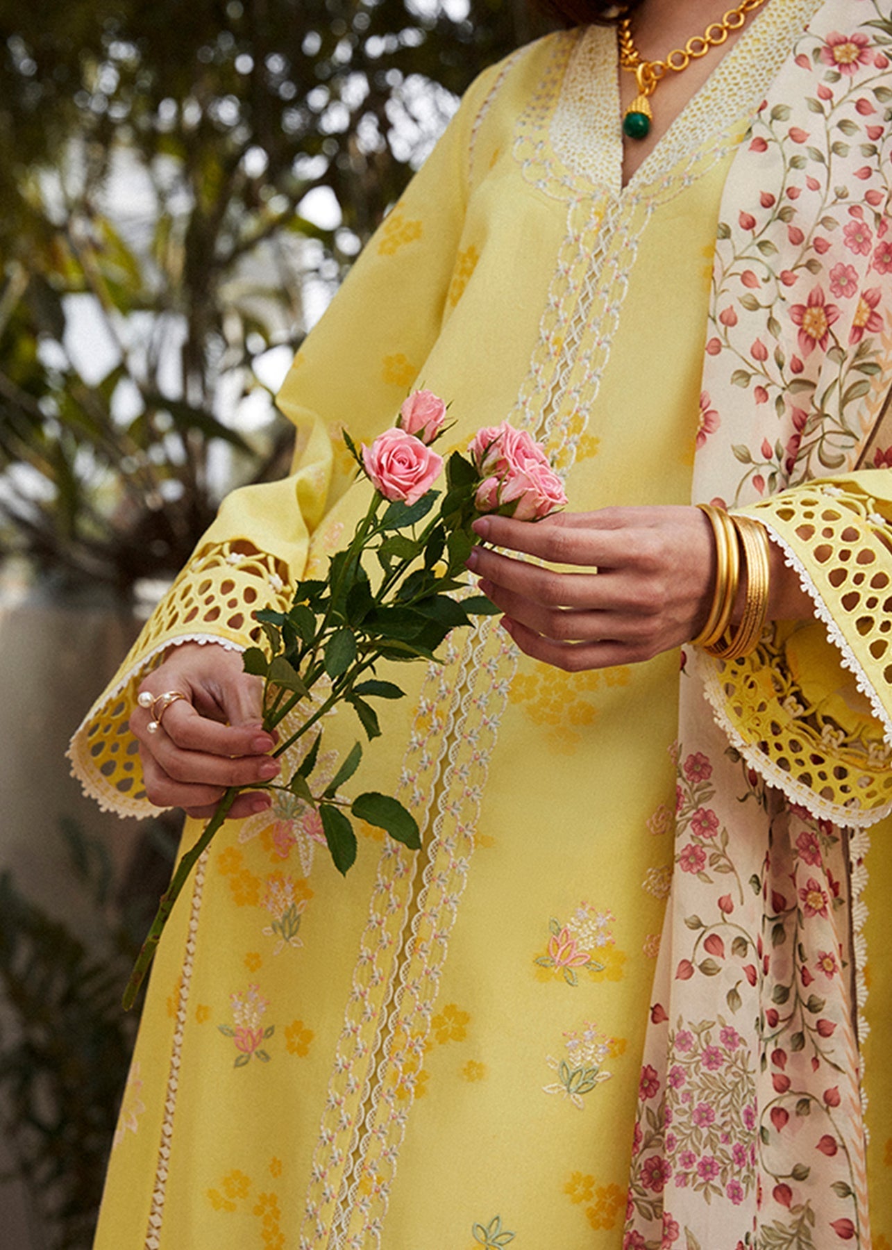 - Crayola yellow lawn jacquard based shirt. Front open with embroidered v-neck and stitching details. Panels with detailed hem. Embroidered sleeves with stitching details.