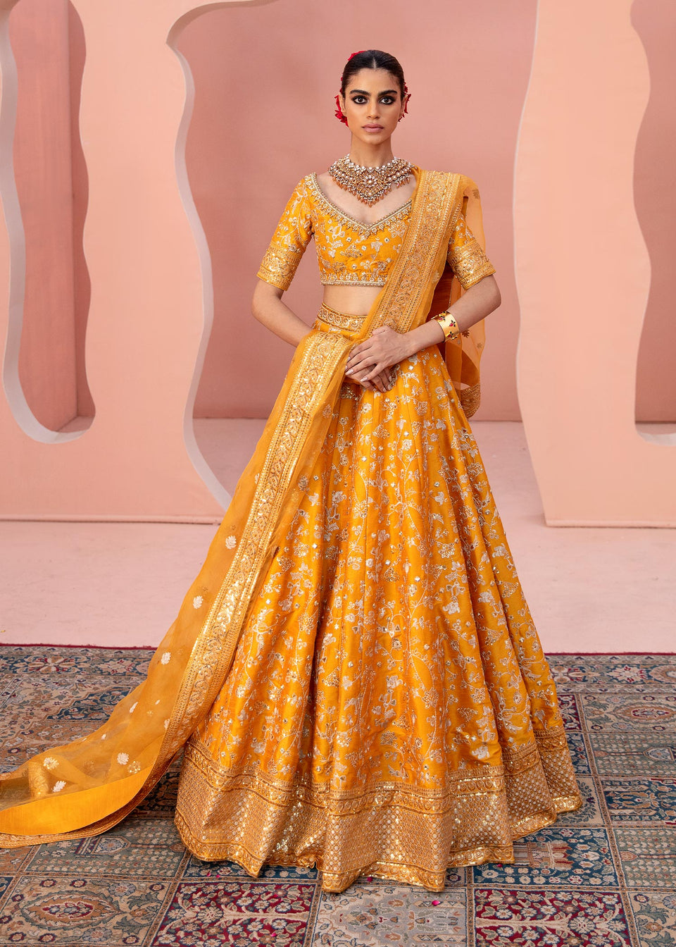 "Zari"A dazzling yellow-hued lehenga with twinkling work of thread and tilla is done all over it. Neckline has intricate hand embellishment featuring zardozi work with pearls and Crystals over a vivid canvas. A perfect charming ensemble for your wedding events.