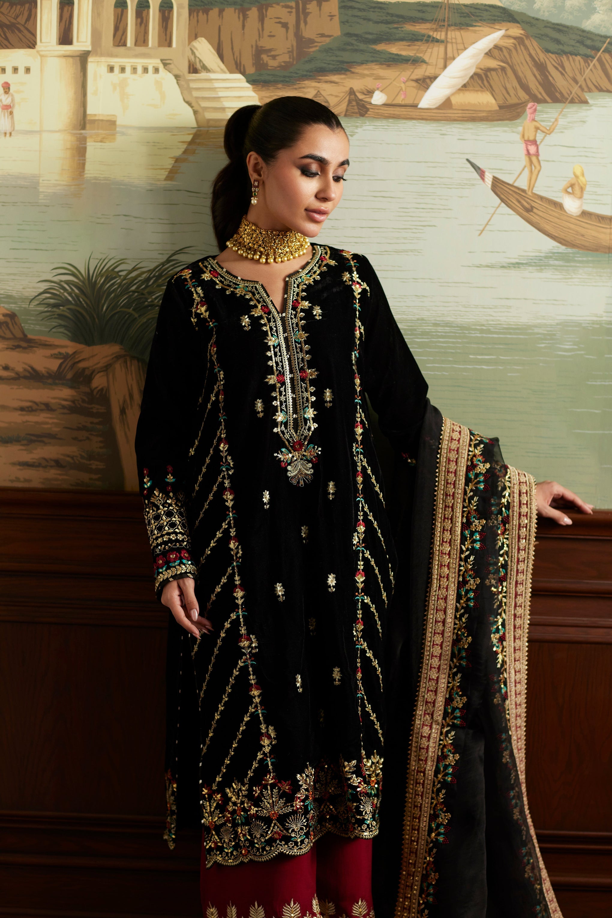 Feel like a timeless beauty in this black and gold kurta. The outfit features delicate floral zardozi kaam from the neck to the border. The look is completed with a stunning chundri dupatta.