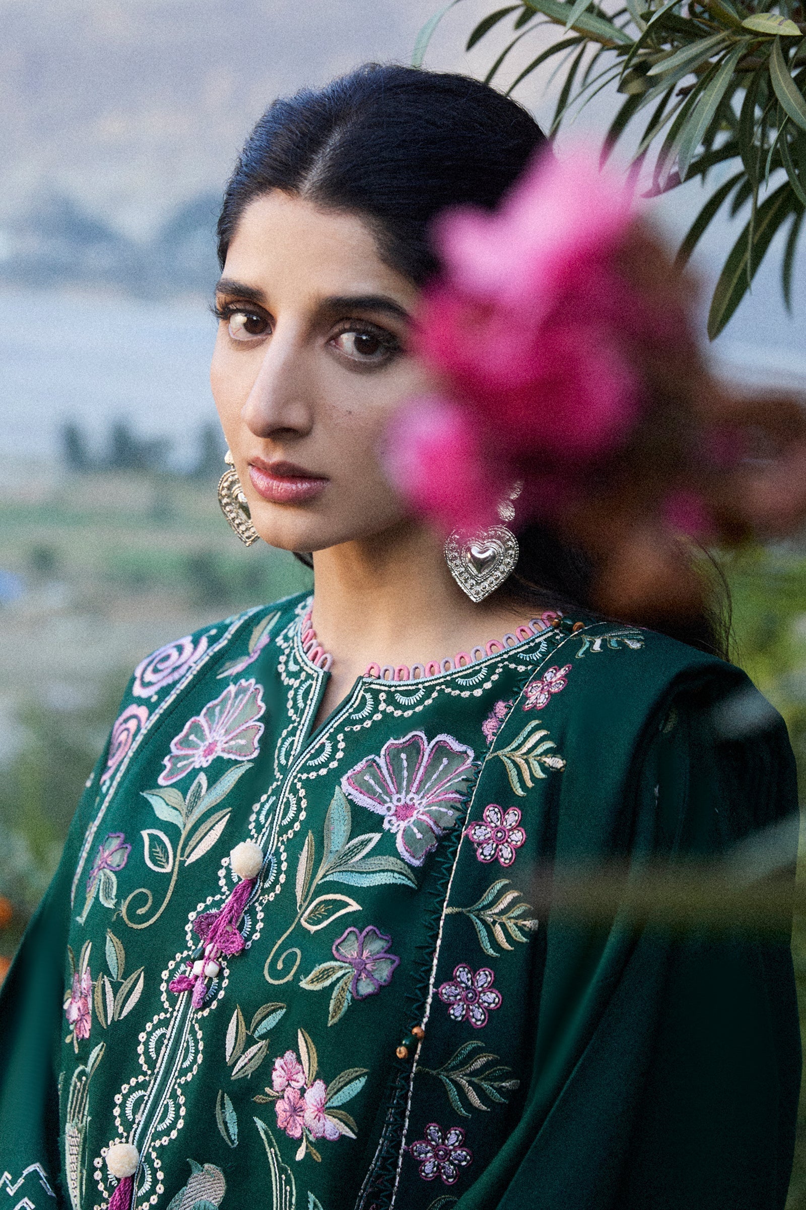 Arsin unfolds like a deep green jewel, its rich, luxurious hue serving as a canvas for artful elegance. Luminous ornamental and floral embroideries in delicate shades of lilac, berry, and sage bloom across the fabric, creating a tapestry of intricate beauty that enchants with every glance. This regal ensemble, crafted in warm, sumptuous khaddar, exudes an inviting depth, while the finely detailed laser-cut accents lend an artisanal flair. Accompanied by an exquisitely illustrated shawl and paired with tonal trousers, Arsin embodies the essence of the modern Zaha woman—confident, poised, and unafraid to stand out. Striking florals blend timeless ethnic charm with a contemporary edge, turning this ensemble into a wearable masterpiece that celebrates the elegance of a woman who commands attention with effortless grace.