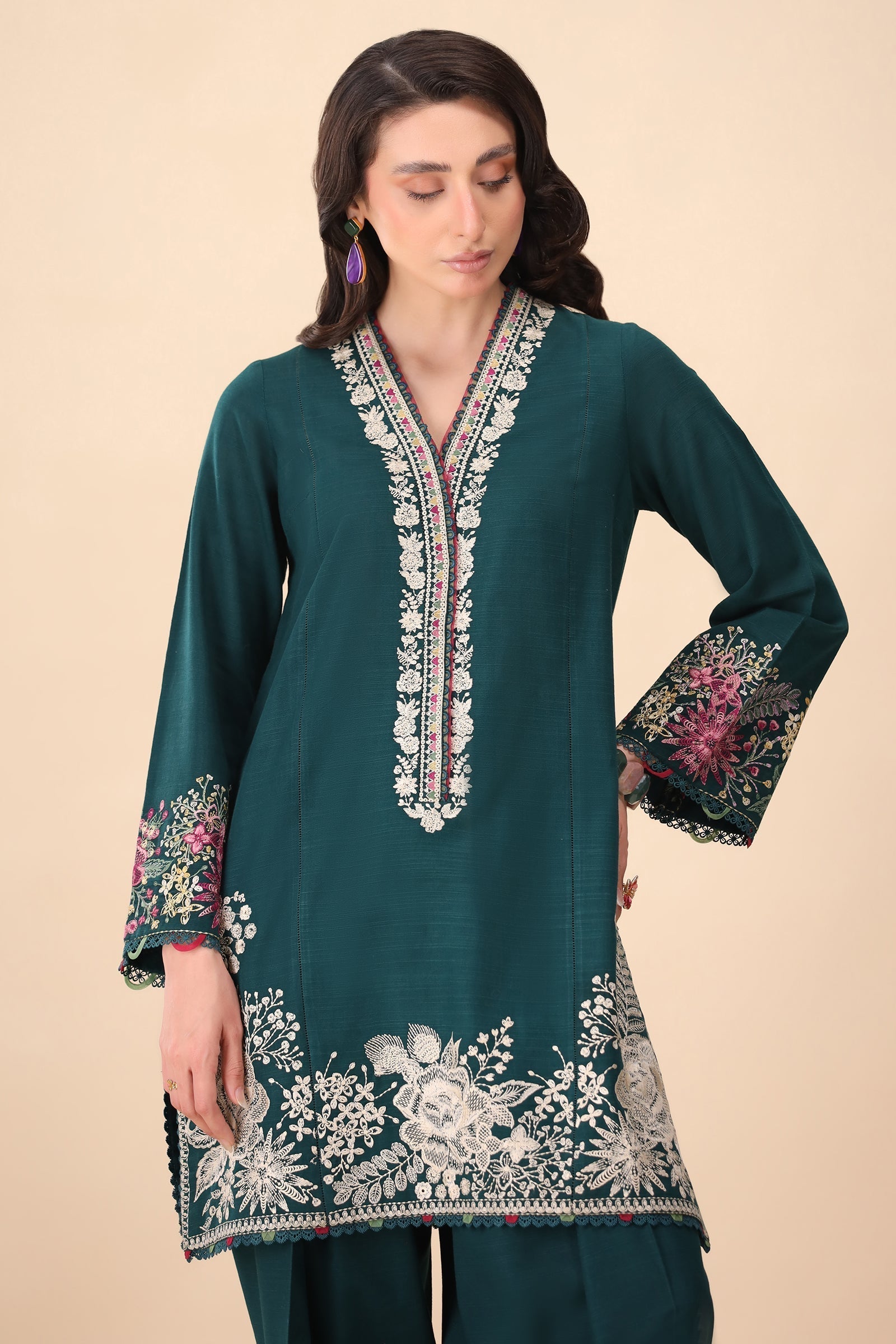 Verdance – Turn heads with this ultra-chic dark green short shirt, featuring a trendy round hem and paired with a stylish shalwar for a modern, effortless vibe. Intricate blooming floral embroidery along the hem and a beautifully crafted neckline with pops of maroon, mustard, and sage elevate this look with a touch of sophistication.