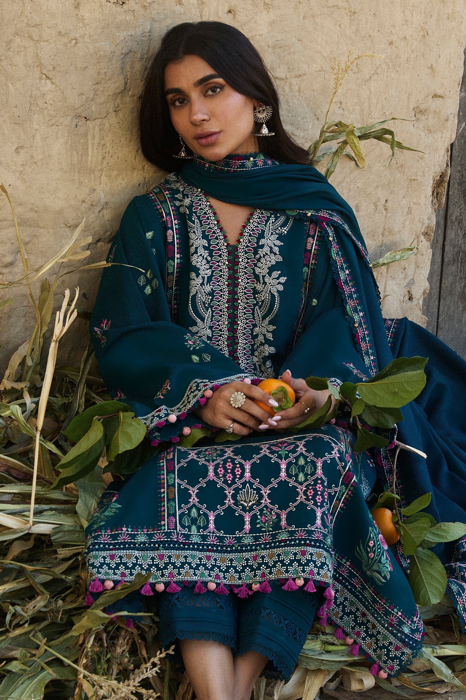 Introducing Zumar,an enchanting fusion of deep, opulent teal and the timeless artistry of tribal heritage, meticulously crafted for the winter season. This exquisite ensemble is fashioned from sumptuous khaddar, adorned with intricate ivory, berry, and moss embroidery that draws inspiration from the ancient motifs of tribal cultures. The bold geometric designs and delicately embroidered borders evoke a sense of rugged elegance, while the rich, wintery hues infuse the ensemble with warmth and depth. Paired with a luxurious karandi dupatta, Zumar effortlessly blends cultural richness with contemporary refinement, creating an ethereal, dreamlike allure. This masterpiece strikes the perfect balance between timeless tradition and the sophisticated elegance of the Zaha woman, enveloping the wearer in both comfort and unparalleled luxury for the colder months.