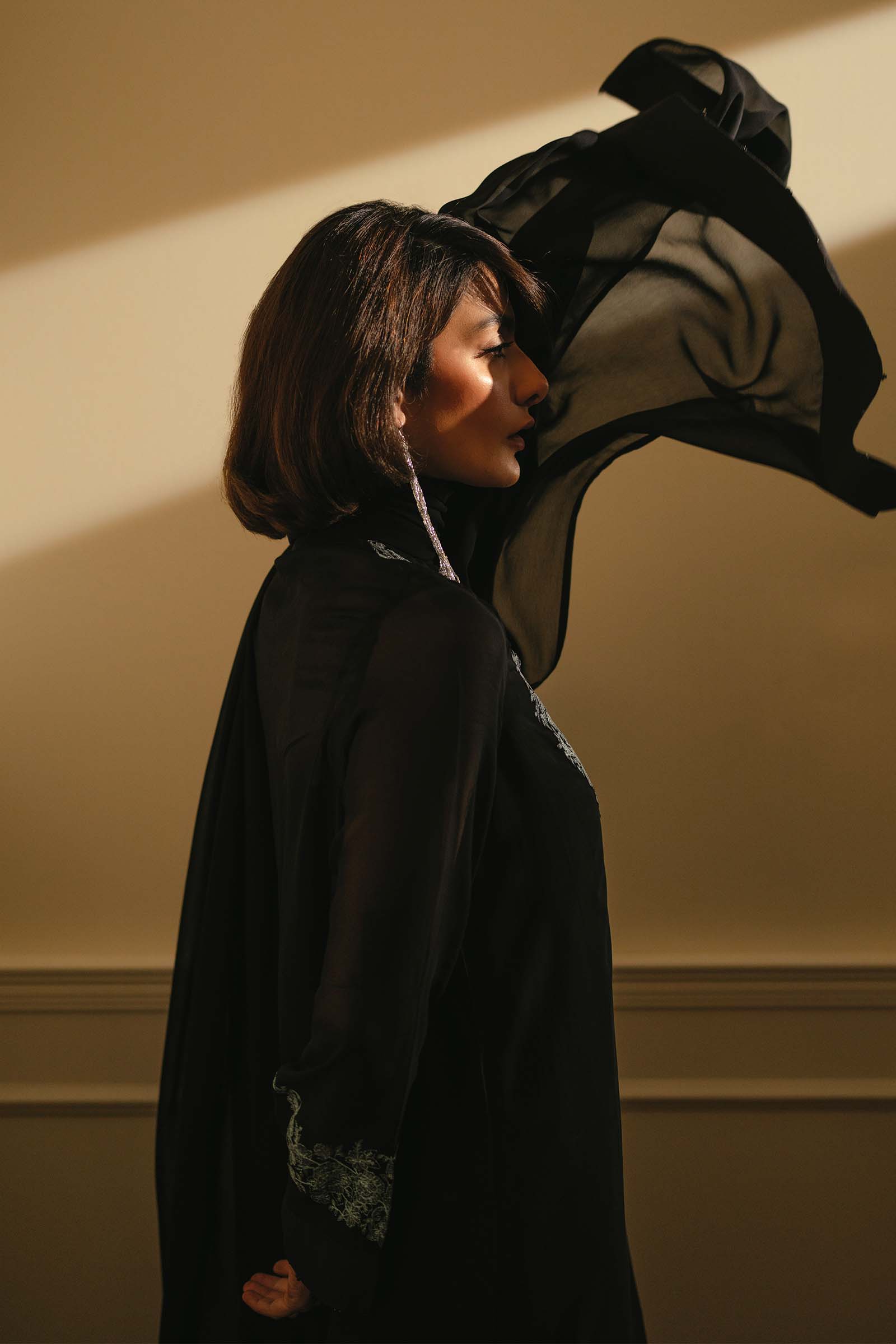 In the realm of style, black transcends mere preference—it becomes an alluring obsession. This attire, bedecked with embroidered neckline and sleeves, enriched with crystal details, includes inner, straight-fit pants, and a luxuriously finished silk dupatta..