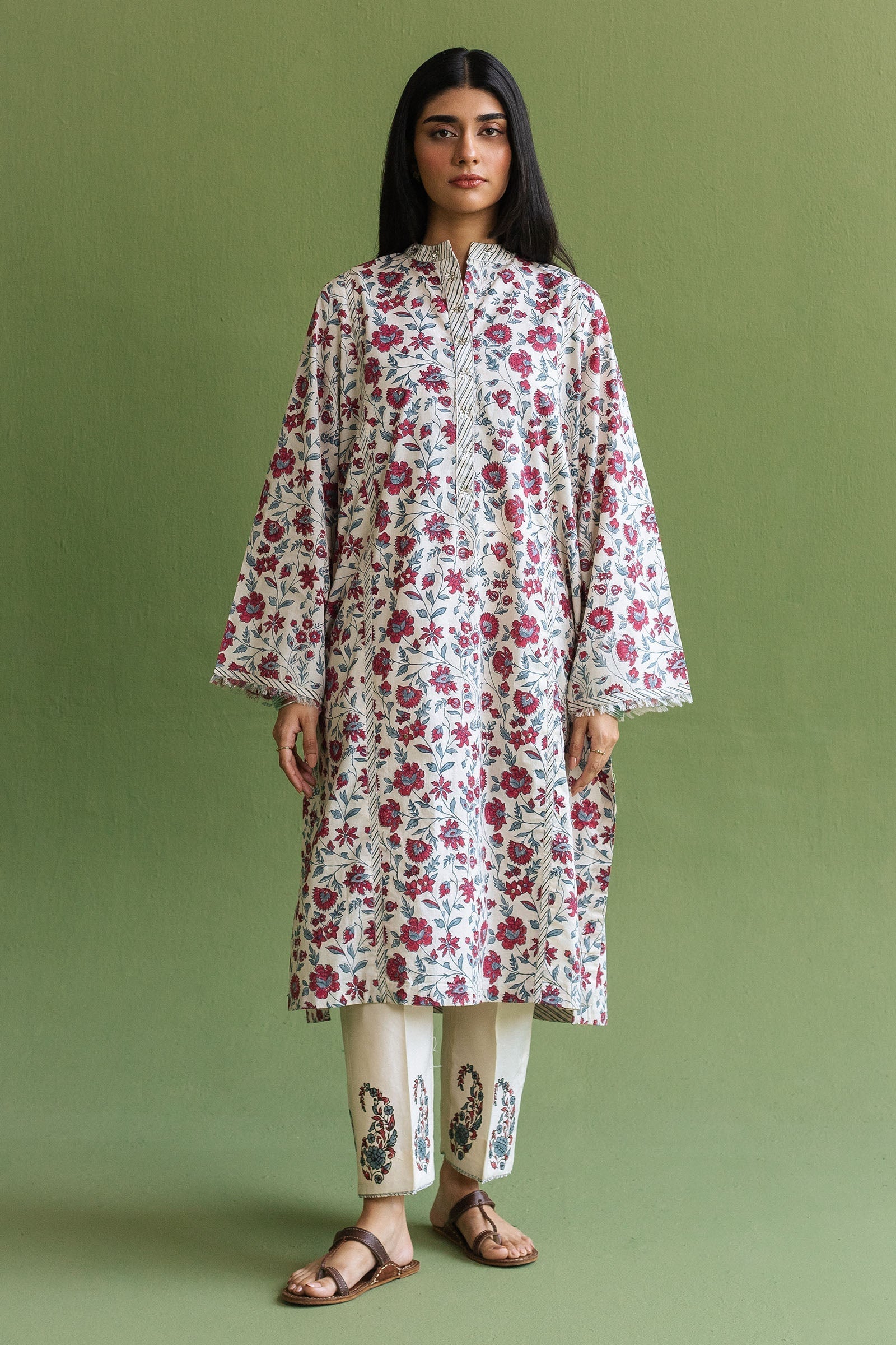 "A long-paneled shirt features a delicately crafted scarlet floraL with mukesh on the neckline. It’s assembled with paisley block printed pants to complete the look.