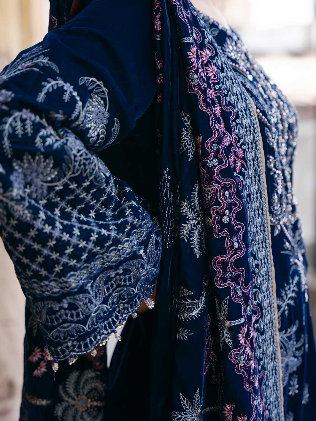 Embroidered Velvet Front (Hand Made)Plain Velvet BackEmbroidered Velvet SleevesEmbroidered Velvet ShawlEmbroidered Velvet Border for Shawl PalluEmbroidered Velvet Border for Front & BackEmbroidered Velvet Border for SleevesEmbroidered Silk Trouser