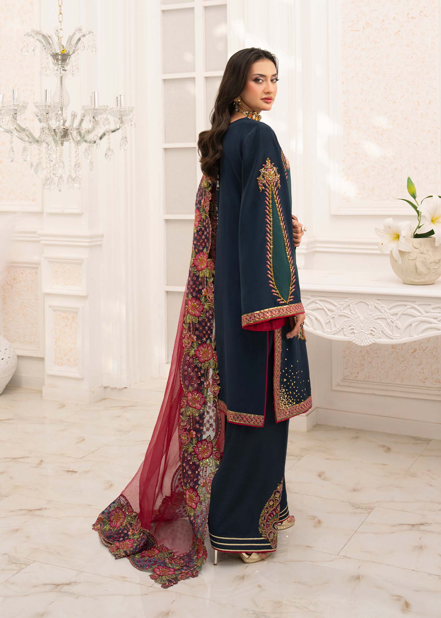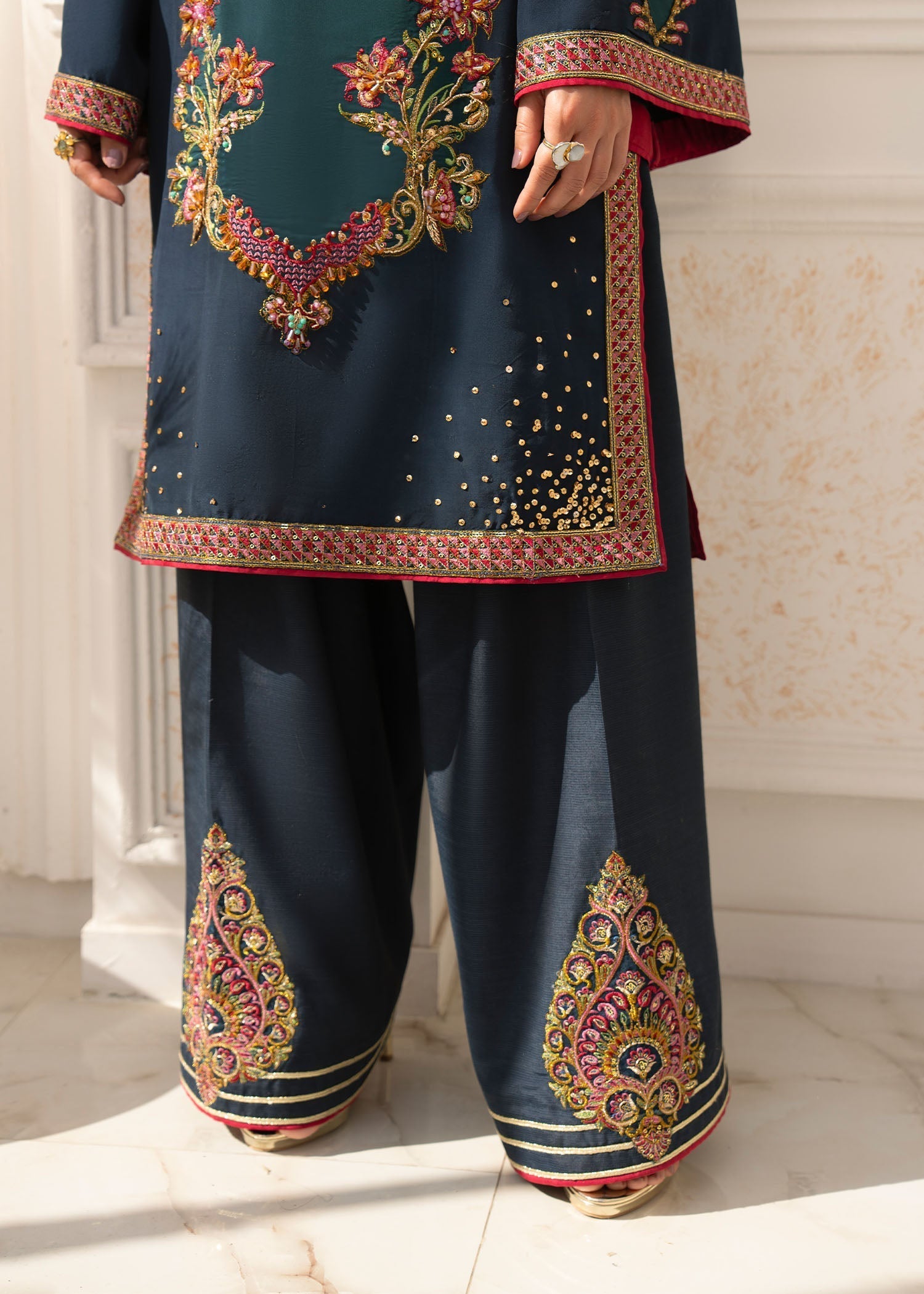 Rusian slik mid thigh length shirt embroidered beautifully with resham and zari hand embellished beautifuly with crystals pearls and naqshi pared with pk raw silk shalwar pants bling with contrasting organza embroidered dupatta.